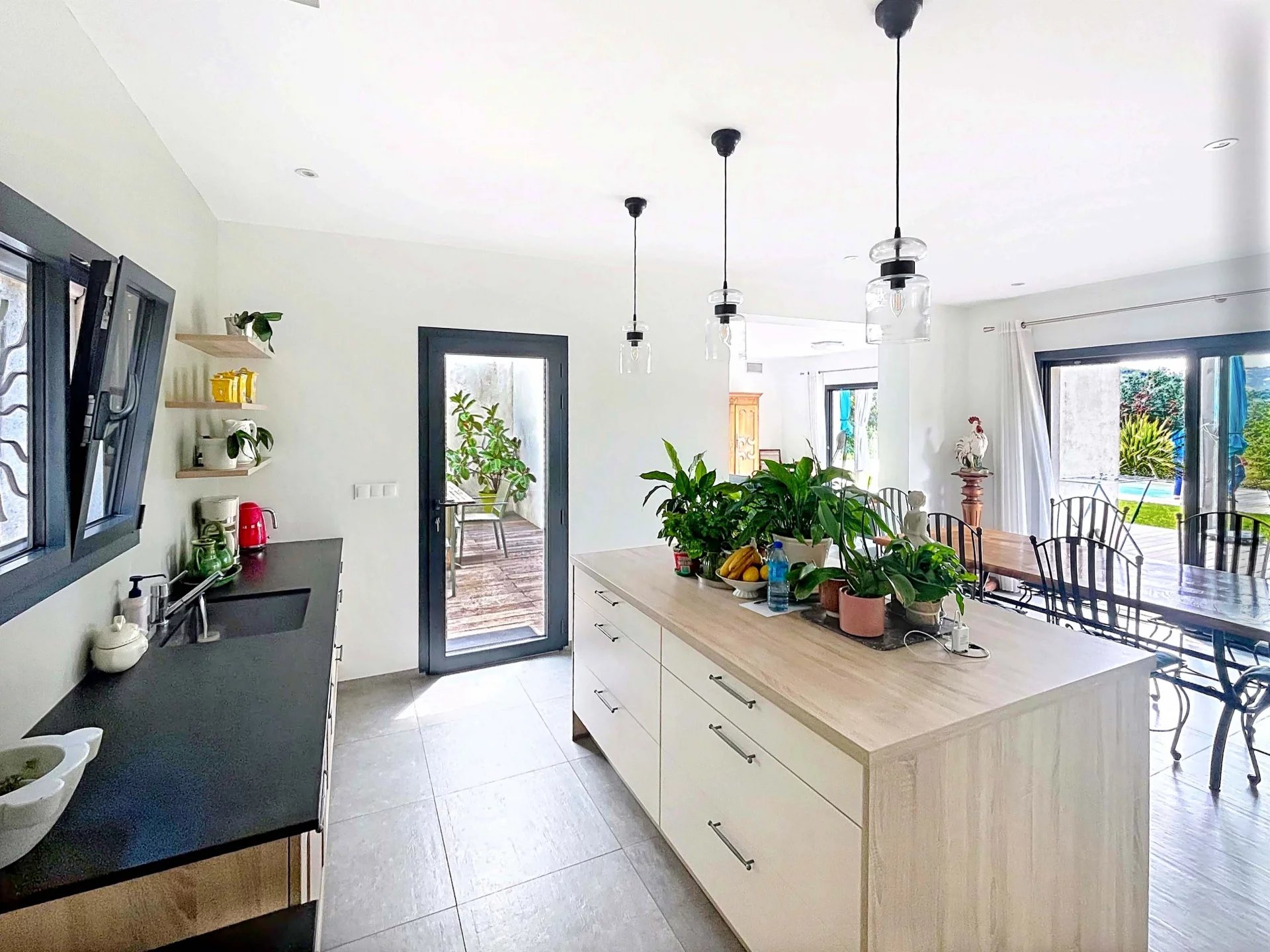 La cuisine contemporaine, dotée de prestations de qualité, est accompagnée d’une buanderie fonctionnelle.