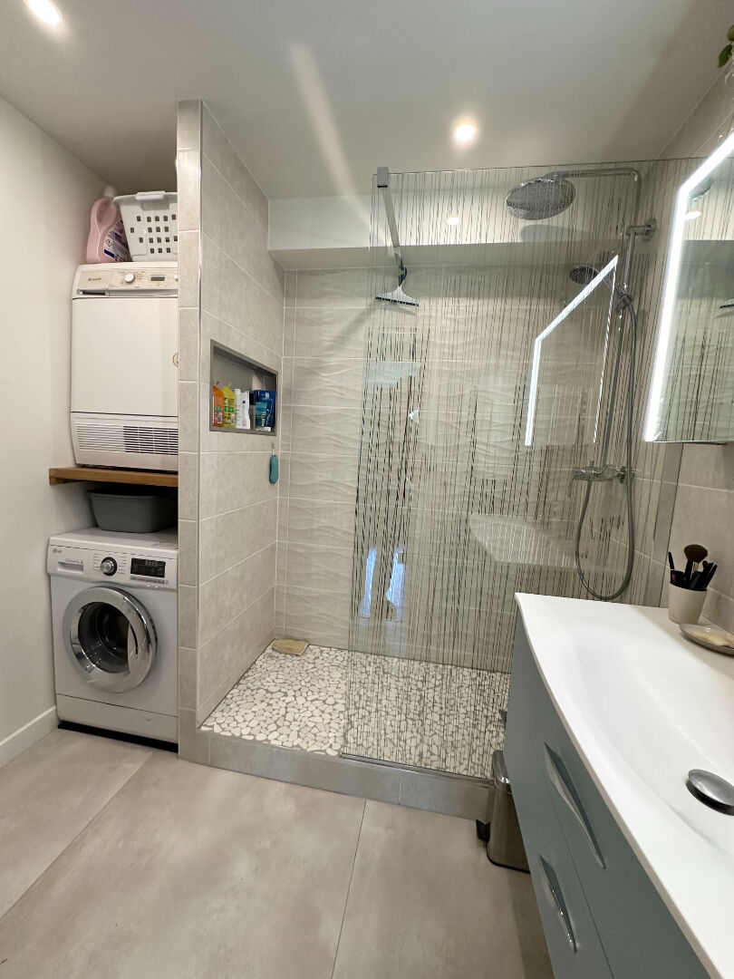 La salle d'eau aux lignes contemporaines intègre un espace buanderie discret les toilettes sont séparées