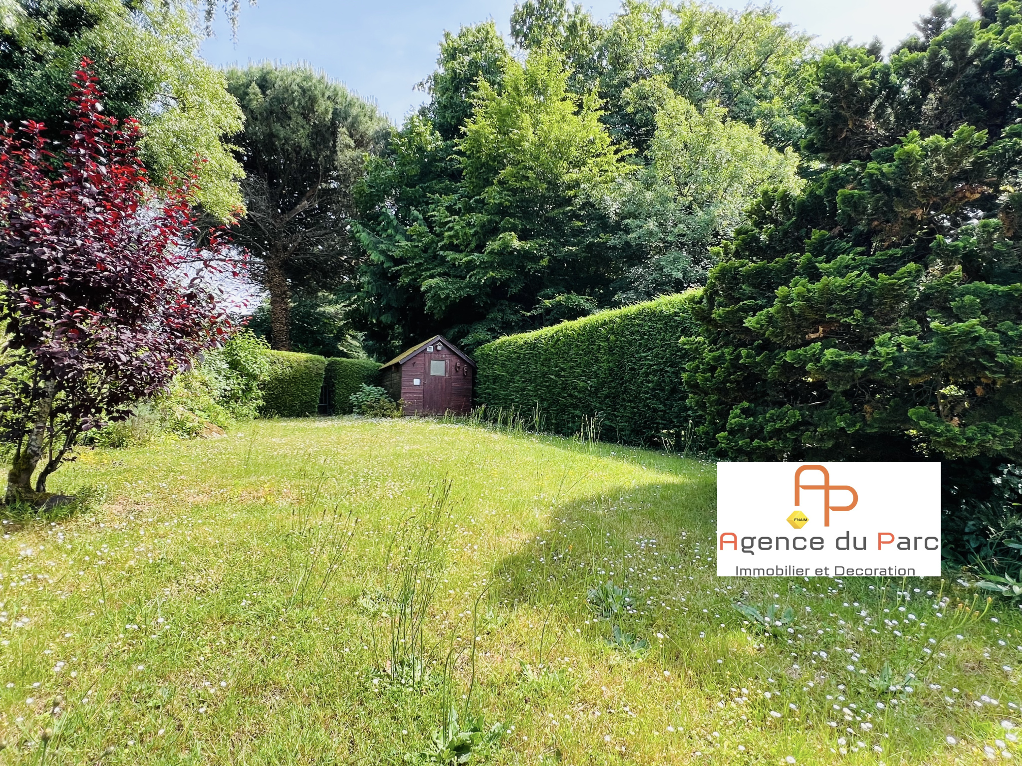 Terrasse avec store-banne, jardin bien clos avec chalet de jardin.