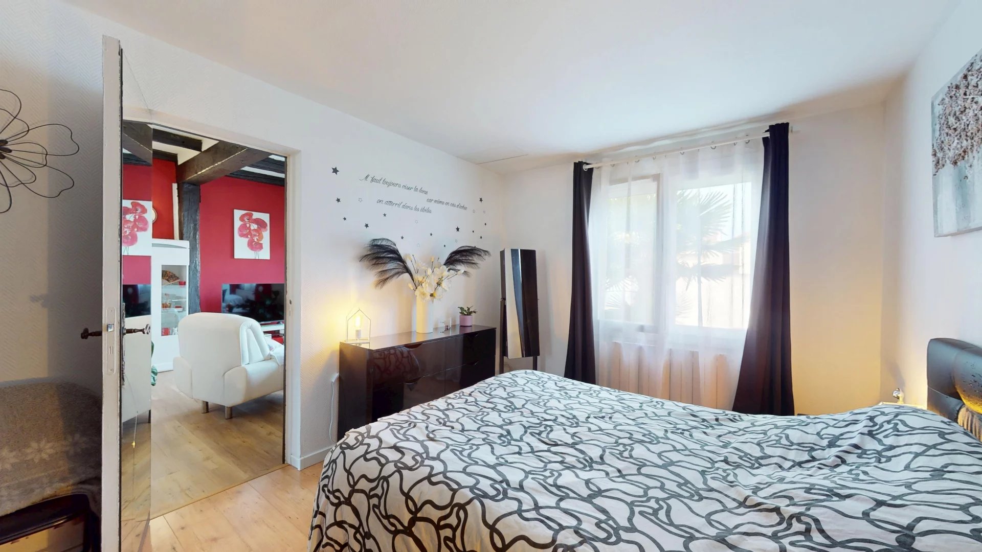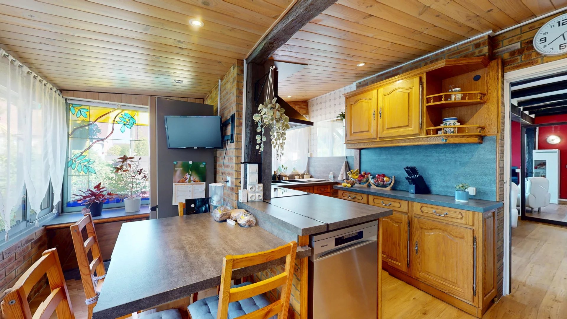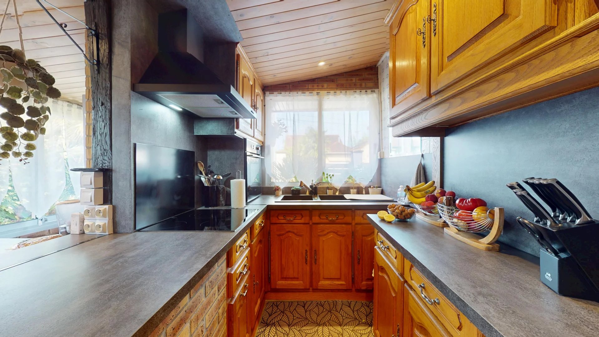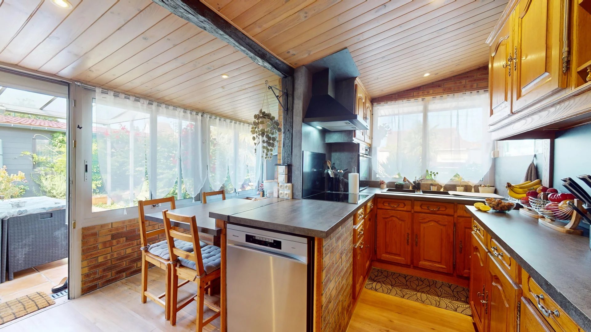 Entièrement de plain-pied, la maison est composée d’un séjour avec cheminée, une grande cuisine avec un espace dinatoire donnant directement sur le jardin. La cuisine a été rénovée récemment par les propriétaires, apportant une note de modernité avec les plans de travail en noir et l’électroménager récent, tout en en gardant le charme et la chaleur du bois des meubles de cuisine.