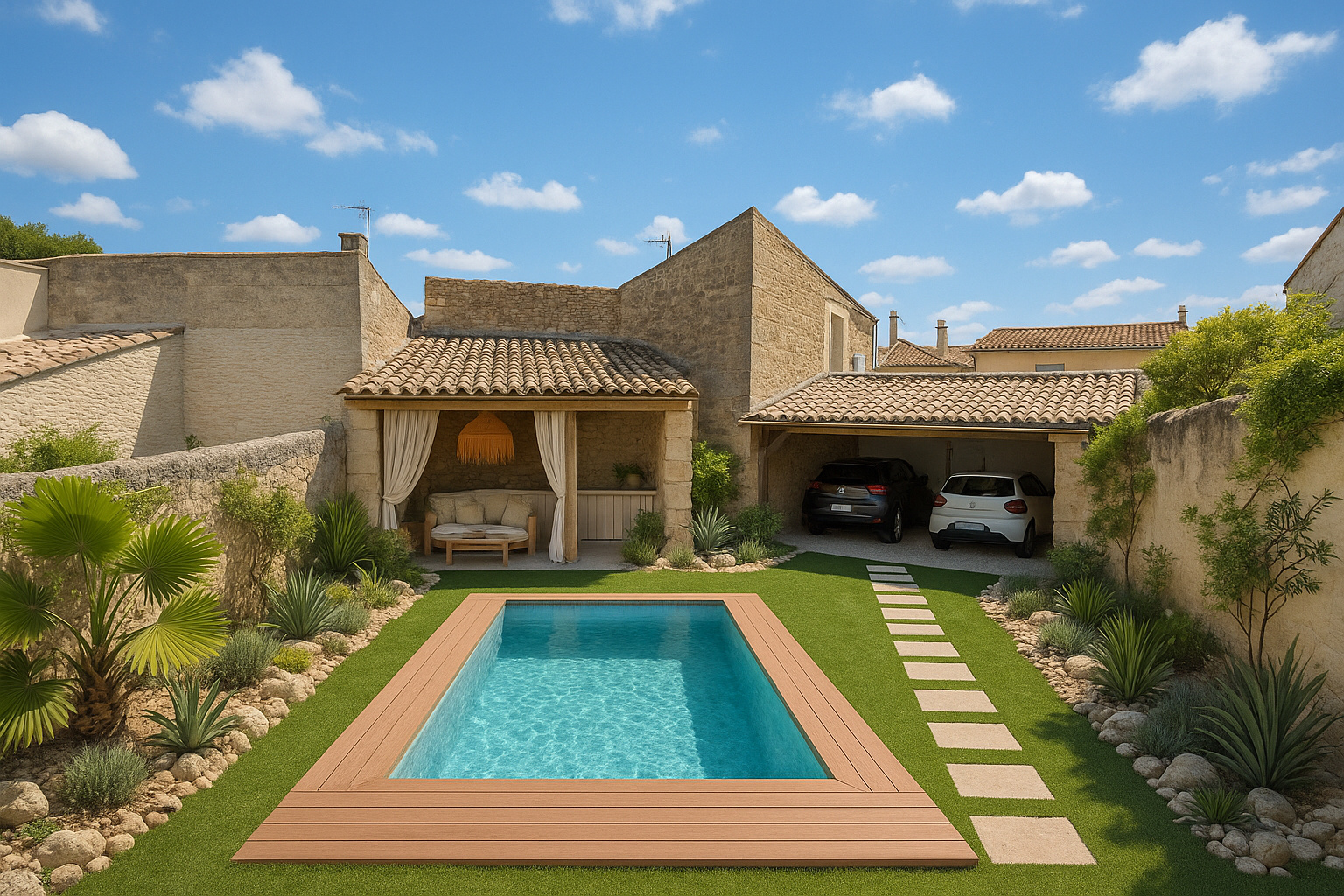 Côté extérieur, une parcelle piscinable de 436 m2 vous acceuillera. Vous pourrez y laisser libre cours à votre créativité : cuisine d'été, studio indépendant ou atelier pour aménager les 30m2 d'espace couvert ? À vous de choisir.