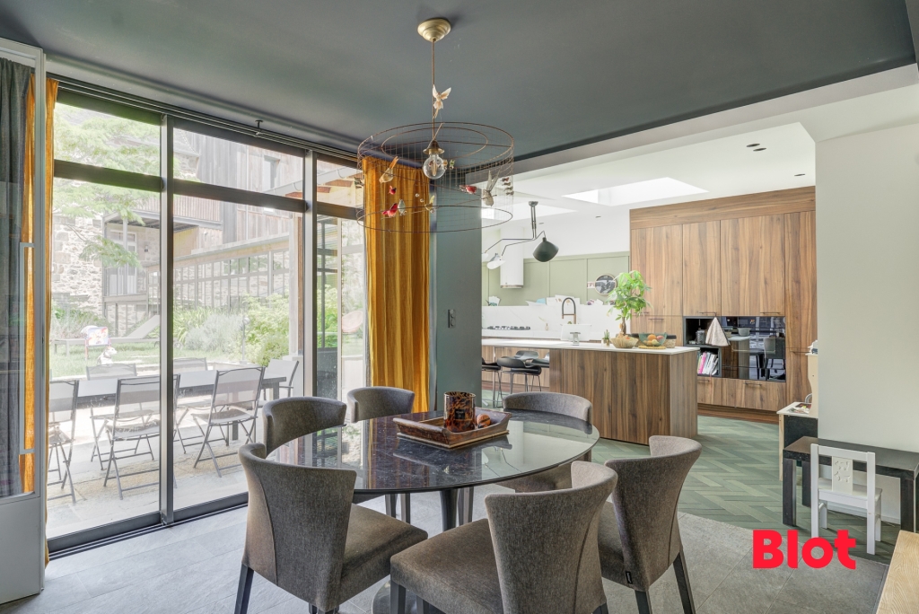 Dès l'entrée par la partie historique, vous serez sous le charme des pierres apparentes et de la cheminée d'époque autour de laquelle vous retrouverez un espace salon, séjour et bar. La partie contemporaine se déploie via une grande galerie en verre qui cache vestiaire et WC et vous emmène vers la cuisine, l'arrière-cuisine et un deuxième séjour pour des soirées plus intimistes. Une suite parentale complète le rez-de-chaussée.