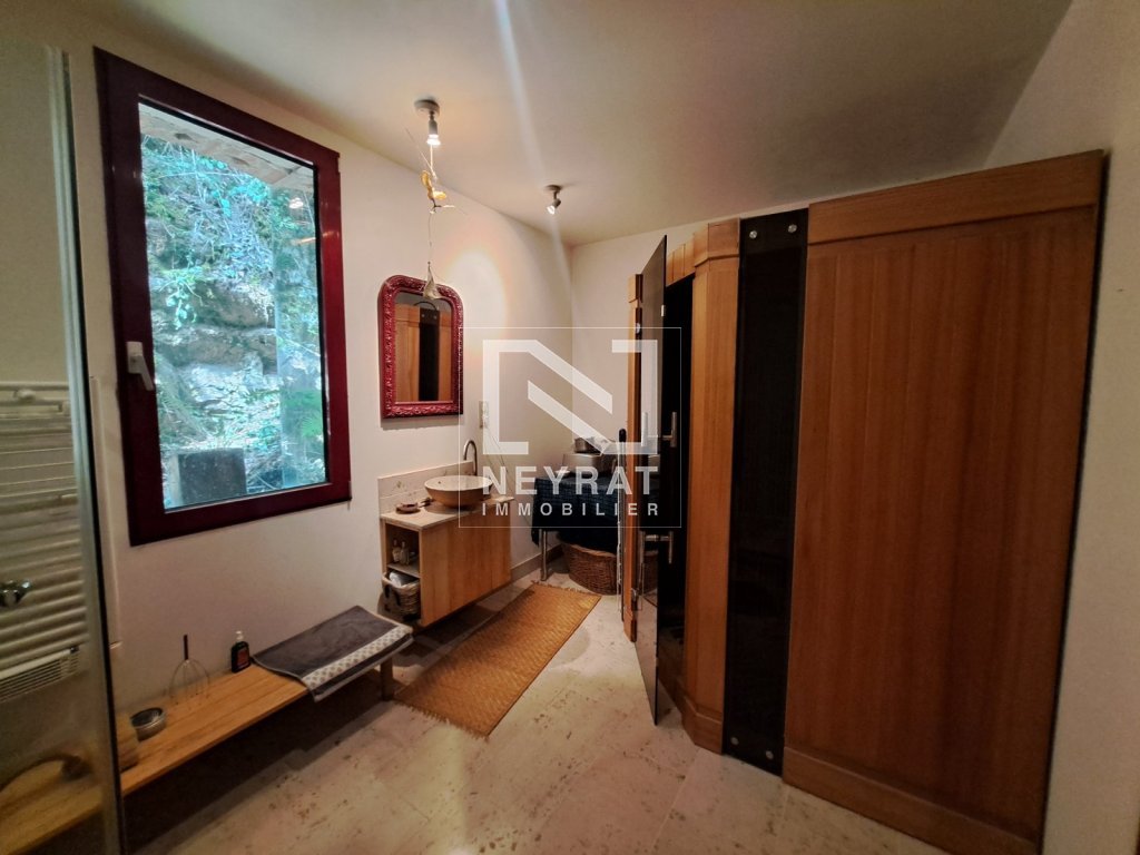Elle se compose d'une partie habitation avec une cuisine ouverte sur un séjour lumineux, un salon cosy, une chambre avec accès à une terrasse, ainsi qu'une salle d'eau équipée d'un sauna et un WC.