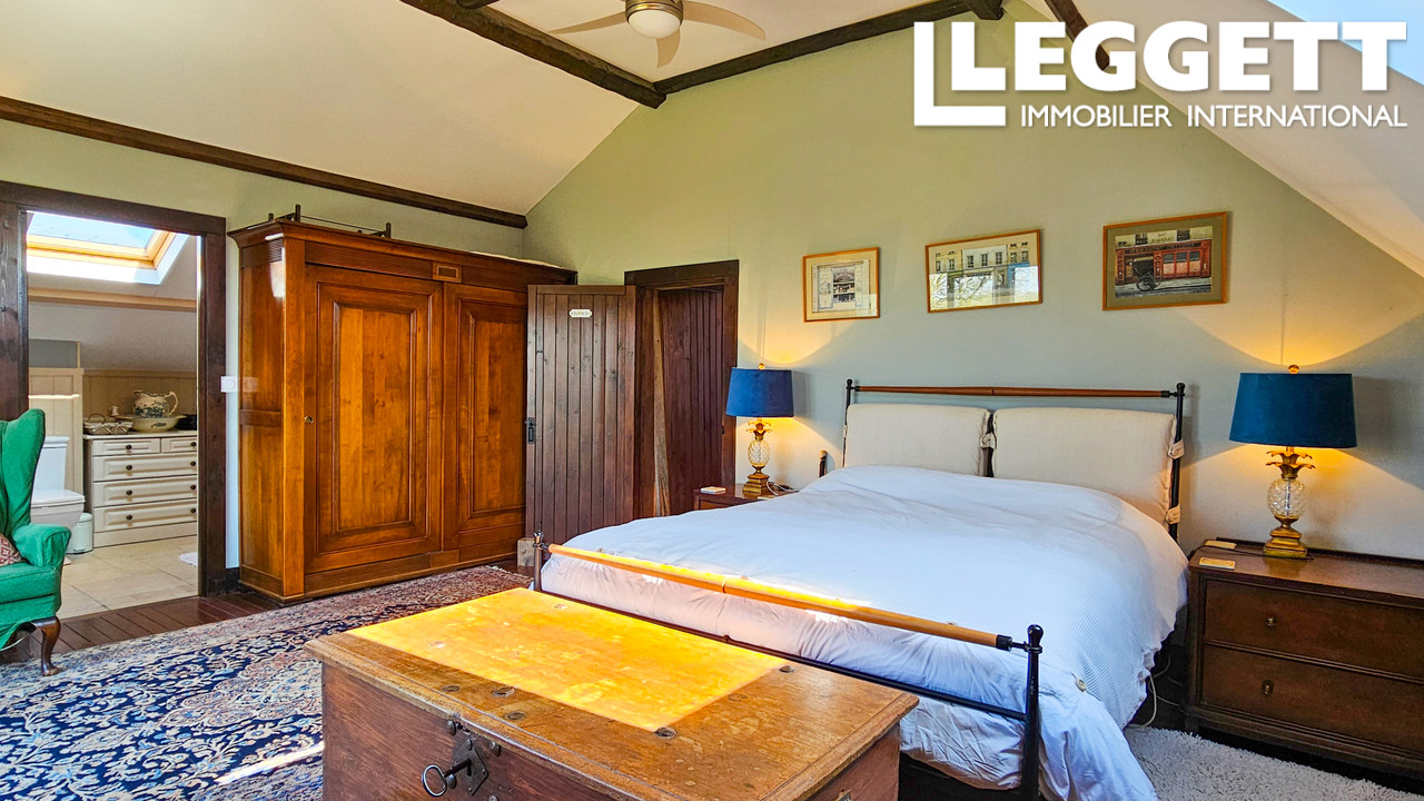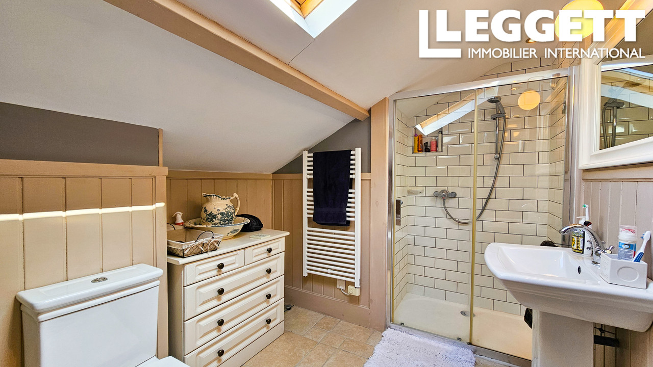 À l'étage, deux chambres (dont une avec salle de bain attenante), une salle d'eau avec WC et une troisième suite parentale avec salle de bain attenante, ainsi qu'un balcon extérieur donnant sur la terrasse en contrebas et la campagne environnante.