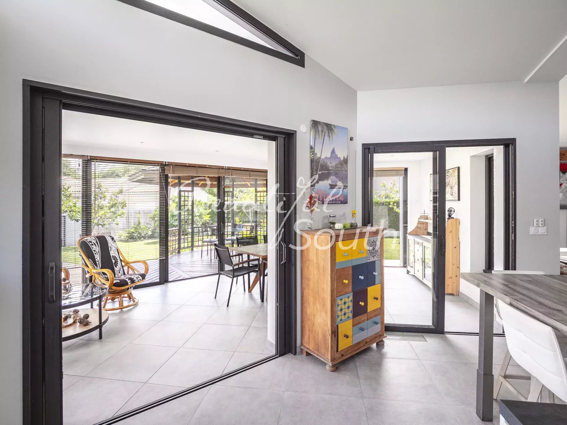 Édifiée sur un terrain joliment arboré de 1001m², la maison se compose de deux niveaux. Dès l’entrée, on est séduit par la luminosité et les volumes de l’espace de vie, véritable cœur de la maison. Le rez-de-chaussée propose une pièce à vivre spacieuse avec cuisine ouverte, donnant sur une terrasse couverte et le jardin. Ce niveau comprend également une suite parentale avec dressing et salle de bains, un espace bureau, un WC indépendant, ainsi qu’un accès direct au garage et à la buanderie.