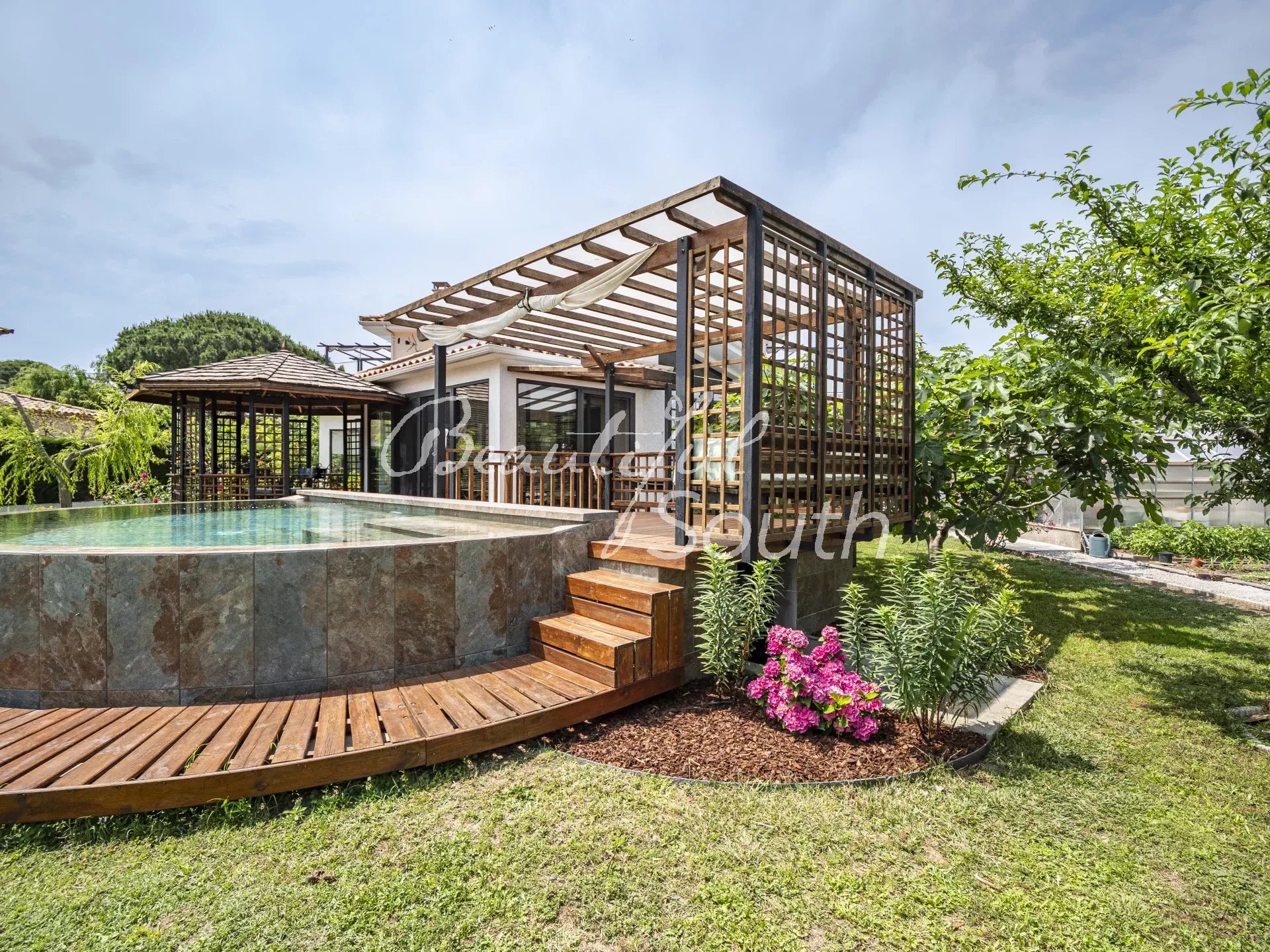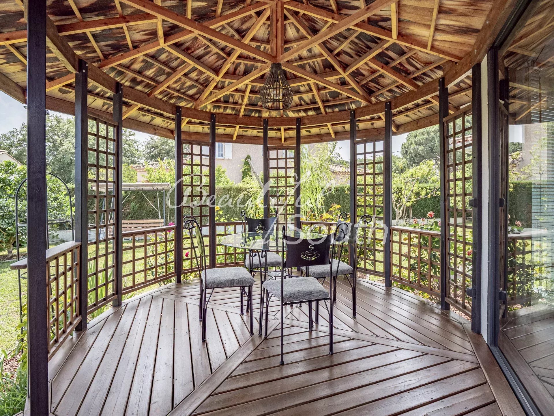 À l’extérieur, les jardins, parfaitement entretenus, offrent un véritable havre de paix : de nombreux arbres fruitiers, un potager, une piscine à la forme originale, ainsi qu’un magnifique kiosque de jardin pour profiter des belles journées ensoleillées.
