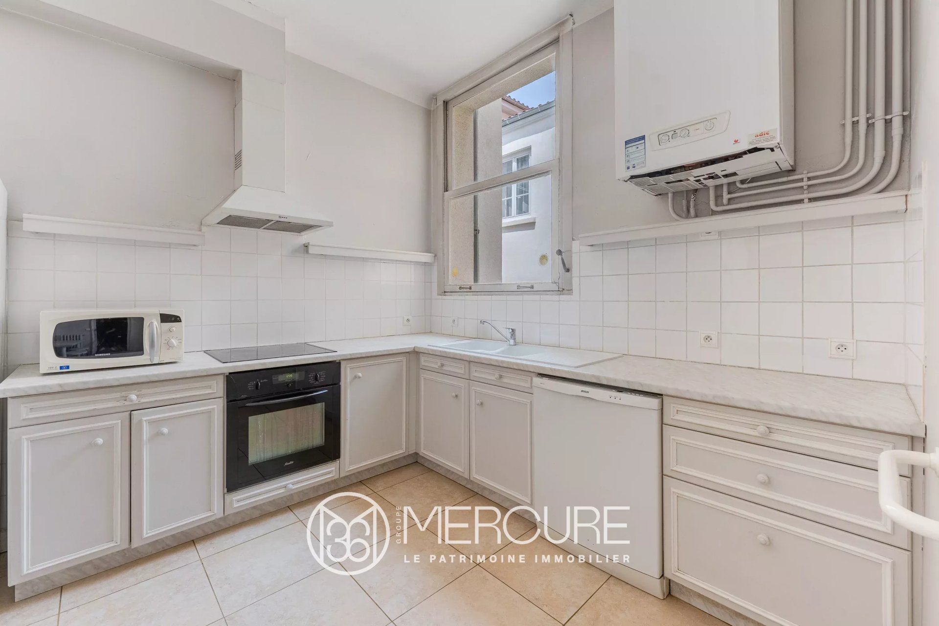 Baignée de lumière, la vaste pièce de vie s’ouvre sur une magnifique terrasse plein sud avec vue dégagée sur la place, véritable havre de paix en ville. La cuisine indépendante, complétée d’un cellier et d’une buanderie, offre un confort quotidien appréciable.