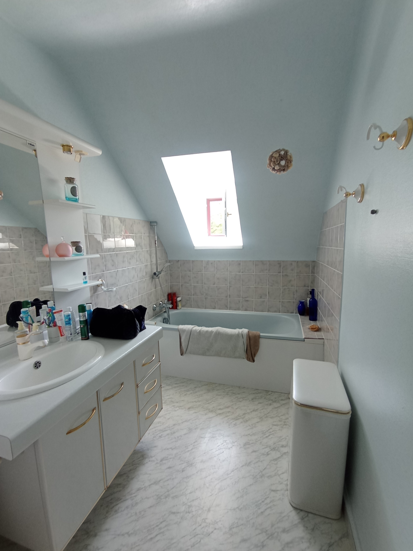 - A l'étage, le palier dessert quatre chambres, une salle de bains, un wc.