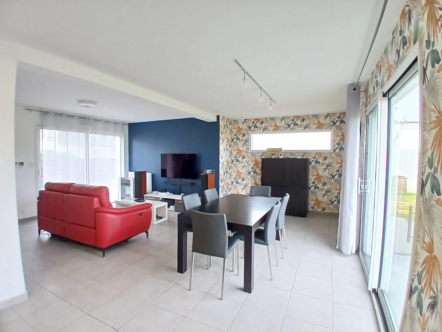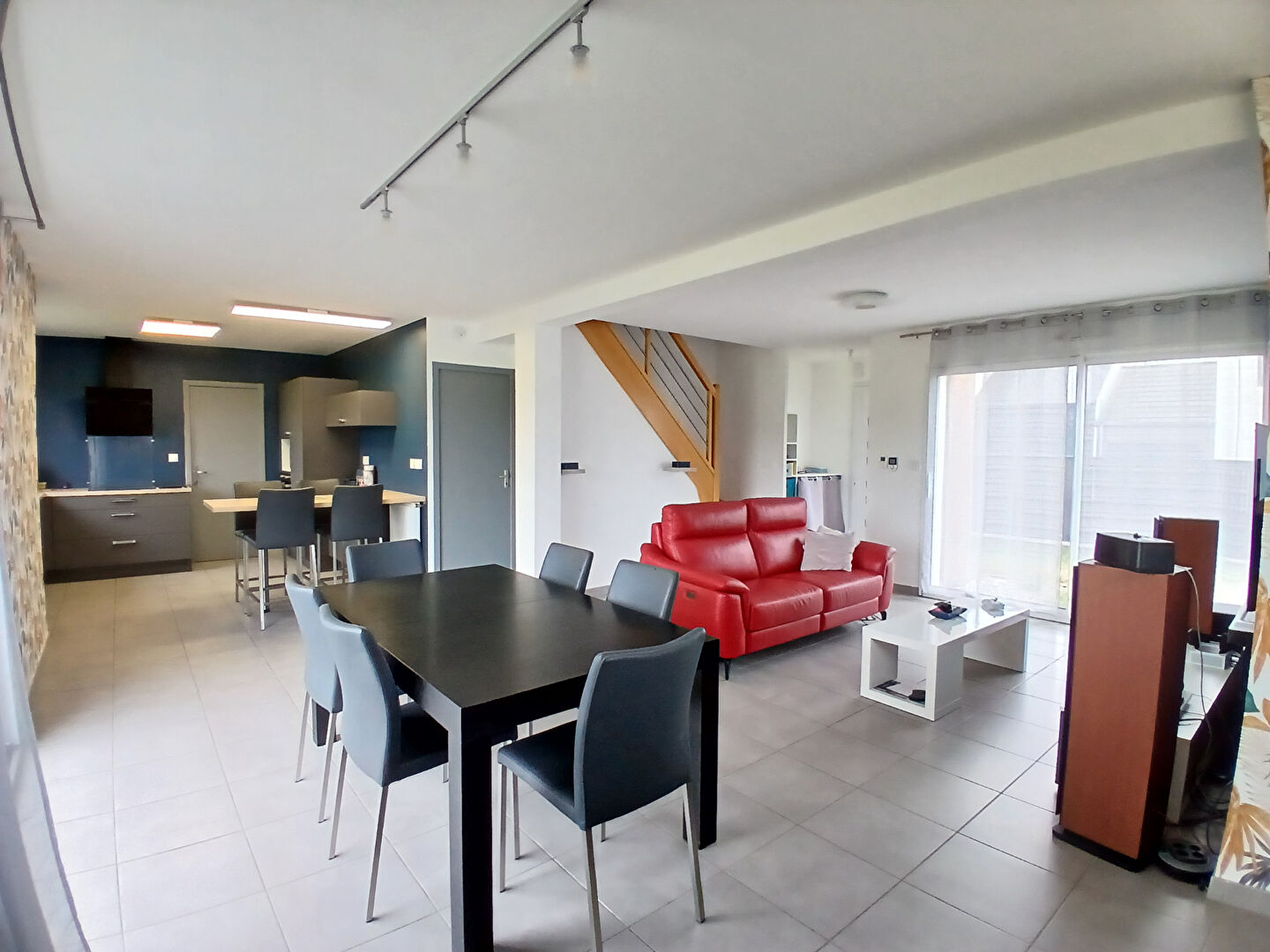 Au rez de chaussée, la pièce de vie lumineuse (triple exposition) de 46m² ouvre sur une belle terrasse avec vue sur la nature (Aucune construction à venir). La cuisine ouverte aménagée et équipée offre une espace déjeunatoire pour 4 personnes.