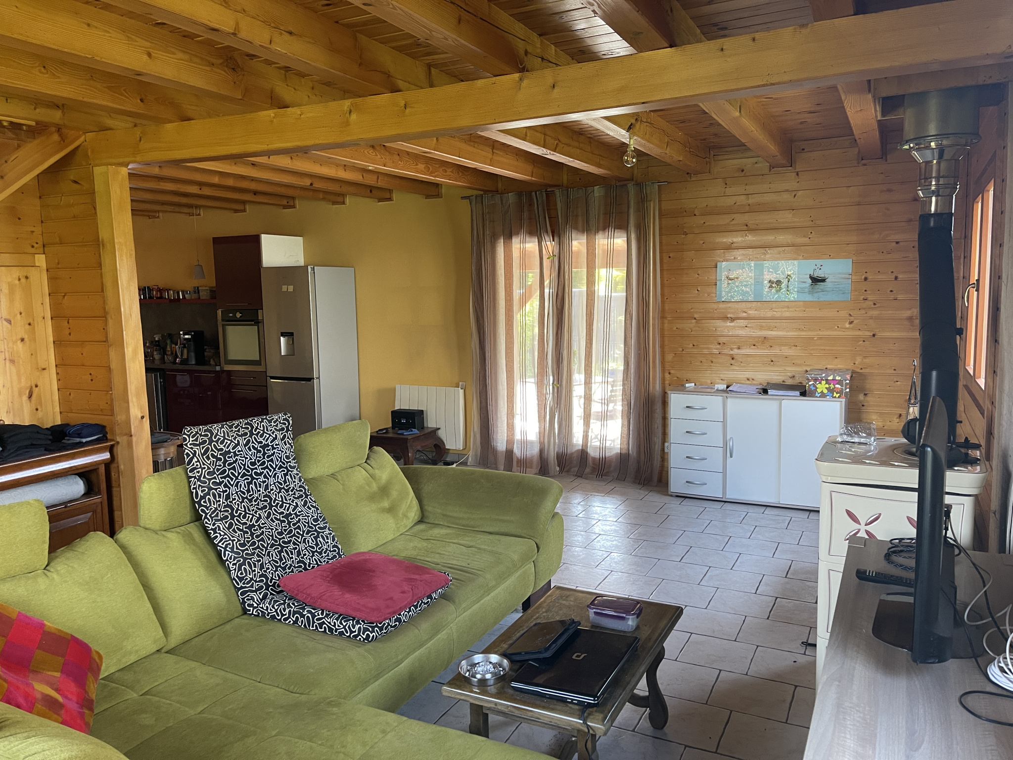 Chauffage par poêle à bois et radiateurs électriques.