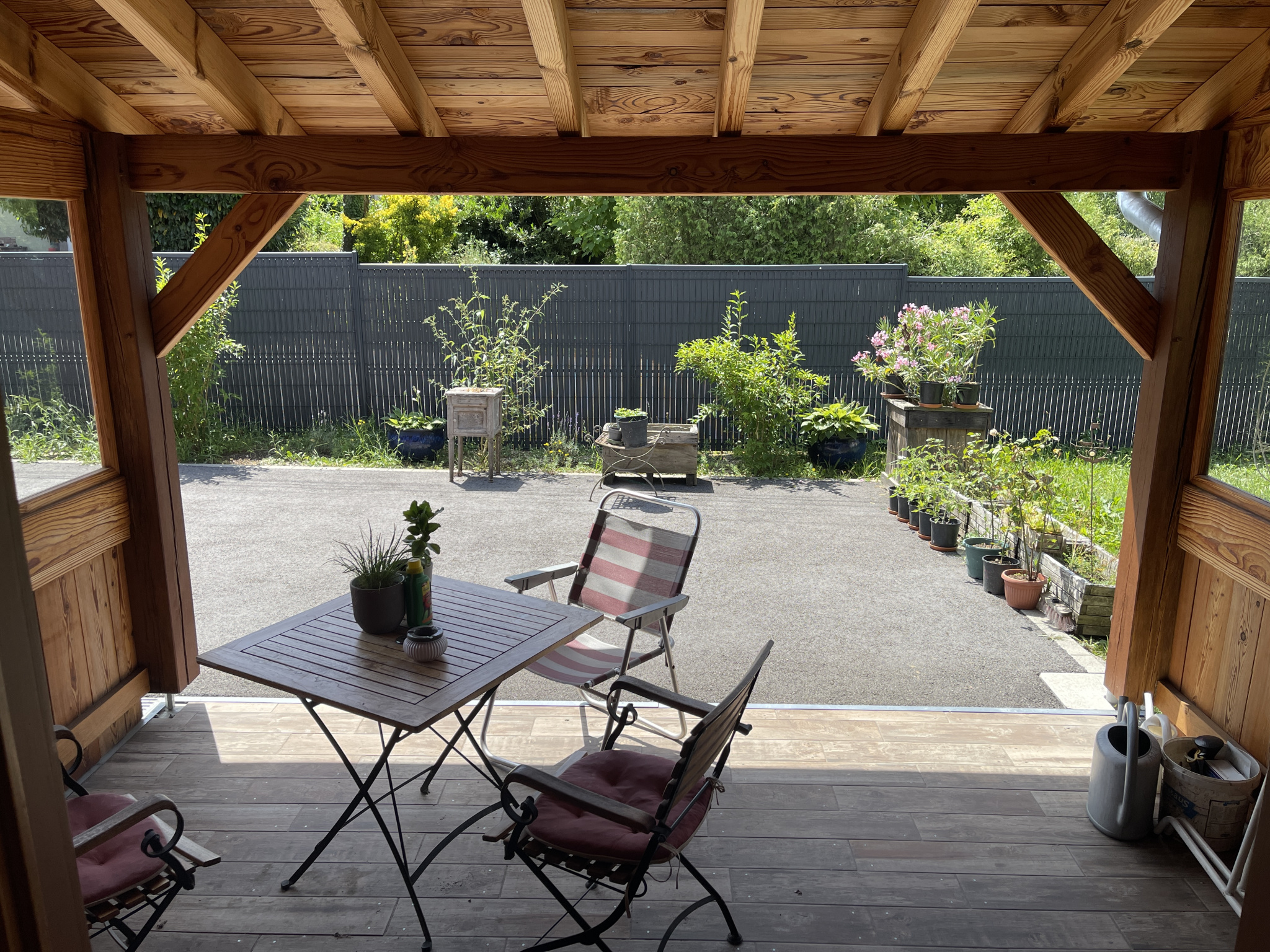 A l'extérieur, joli terrain clos et arboré, terrasse couverte, garage et abri bois.