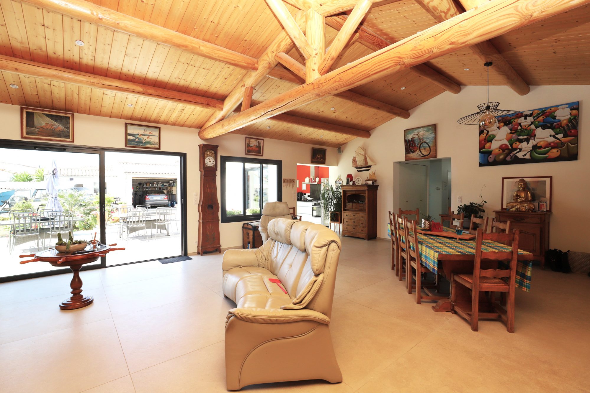 De plain-pied et aux normes PMR, d'une superficie habitable de 165,29 m², elle est composée d'une entrée avec de grands placards de rangement, une grande pièce de vie avec cuisine équipée ouverte sur le jardin, trois chambres possédant chacune une salle d'eau, dont une suite parentale ouverte sur le jardin avec dressing, salle d'eau et wc, une lingerie, un cellier, wc séparé, une cuisine d'été, deux garages et un atelier.