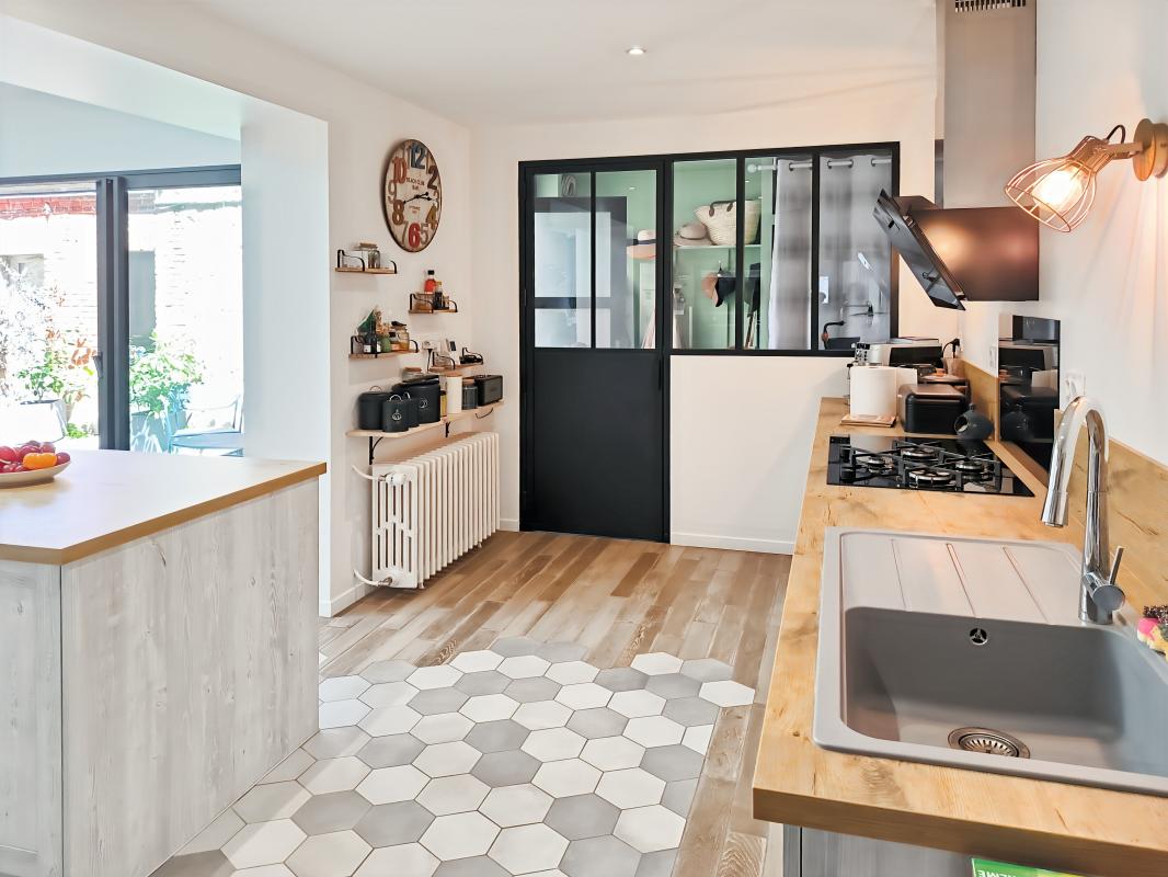 La cuisine semi-ouverte, spacieuse, fonctionnelle et contemporaine, bénéficie elle aussi d'une belle luminosité naturelle et d'un accès direct à une agréable terrasse intérieur, parfaite pour vos repas en extérieur en toute intimité.