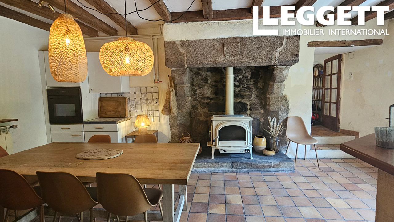 Au rez-de chaussée, une cuisine avec un poêle à bois Jotul récent, un séjour avec vue sur la campagne avec un insert à bois récent, un salon, deux chambres, une salle de bain et un WC.