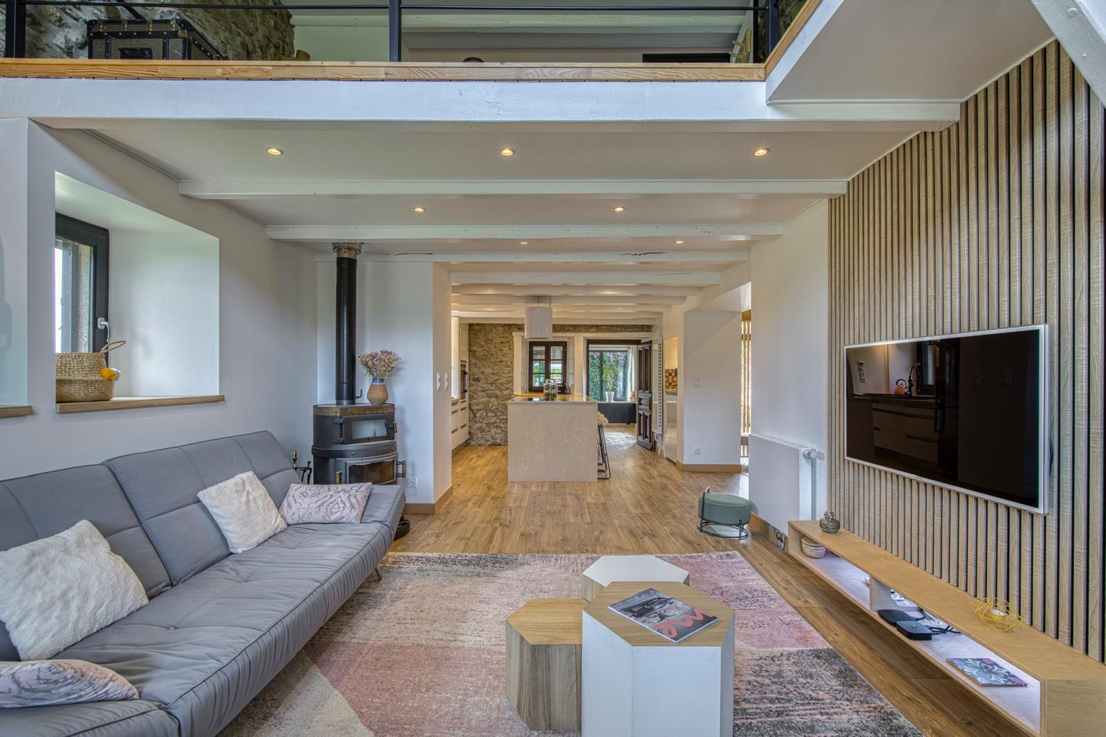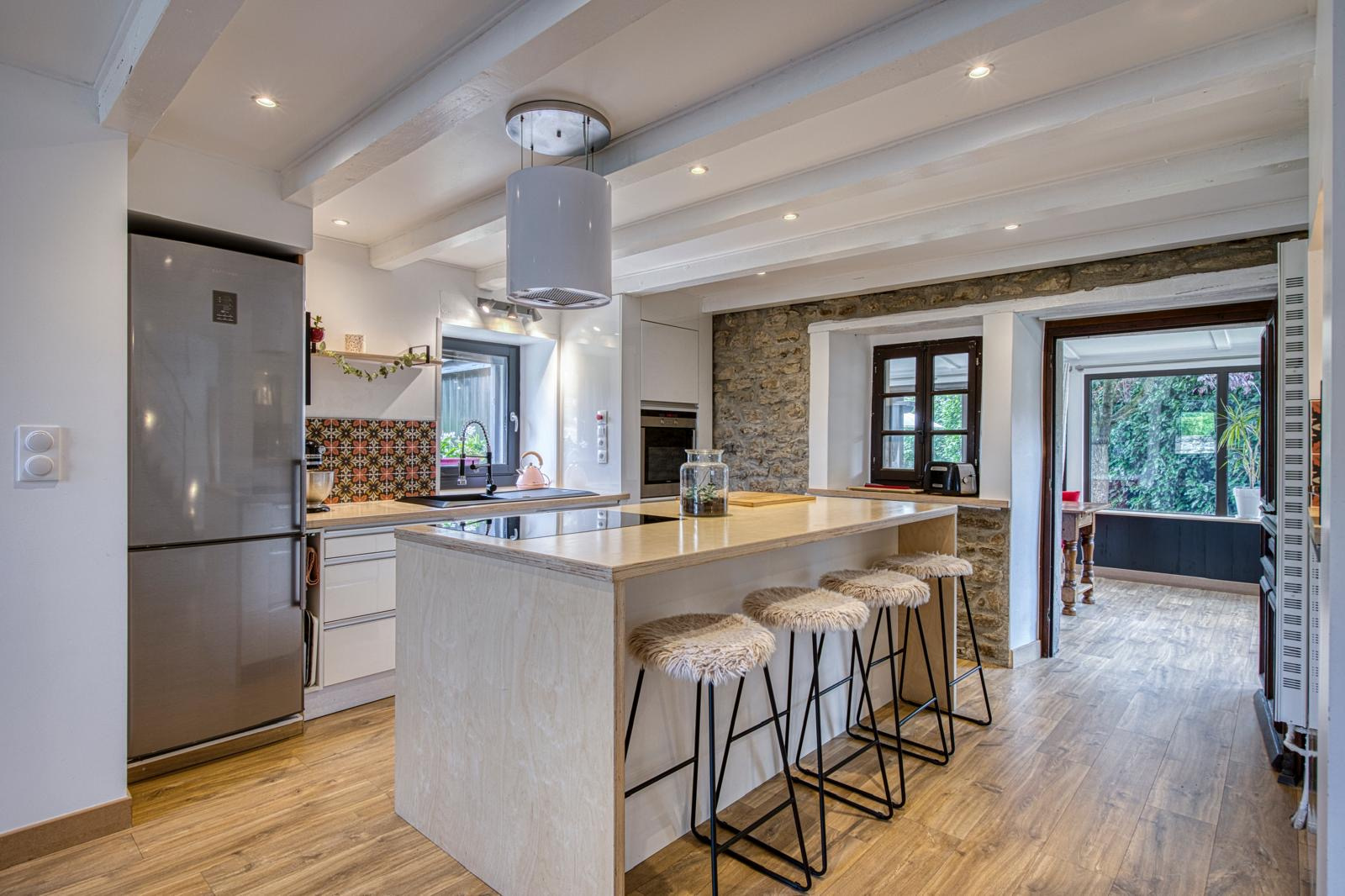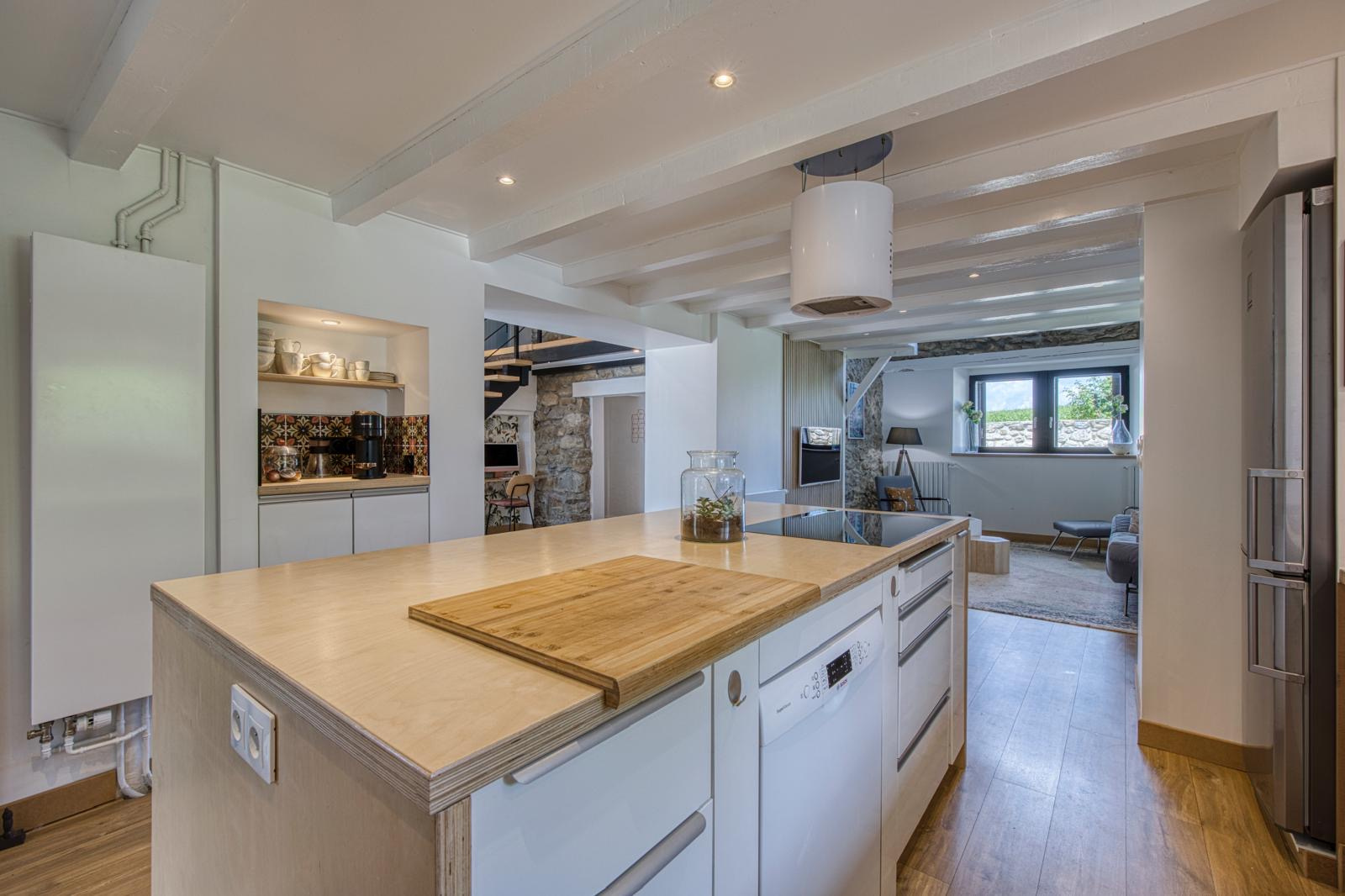 La cuisine américaine équipée, à la fois moderne et conviviale, s'ouvre sur un salon chaleureux où un poêle à bois diffuse une atmosphère douce et accueillante, parfaite pour les soirées d'hiver.