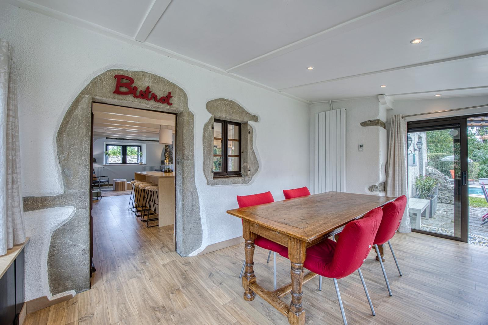 La salle à manger, installée dans une véranda baignée de lumière, offre une vue apaisante sur la verdure environnante et communique directement avec la terrasse et la piscine. C'est ici que les saisons se vivent pleinement : les repas d'été à l'extérieur, les petits-déjeuners d'hiver face au jardin, les moments de détente au bord de l'eau...