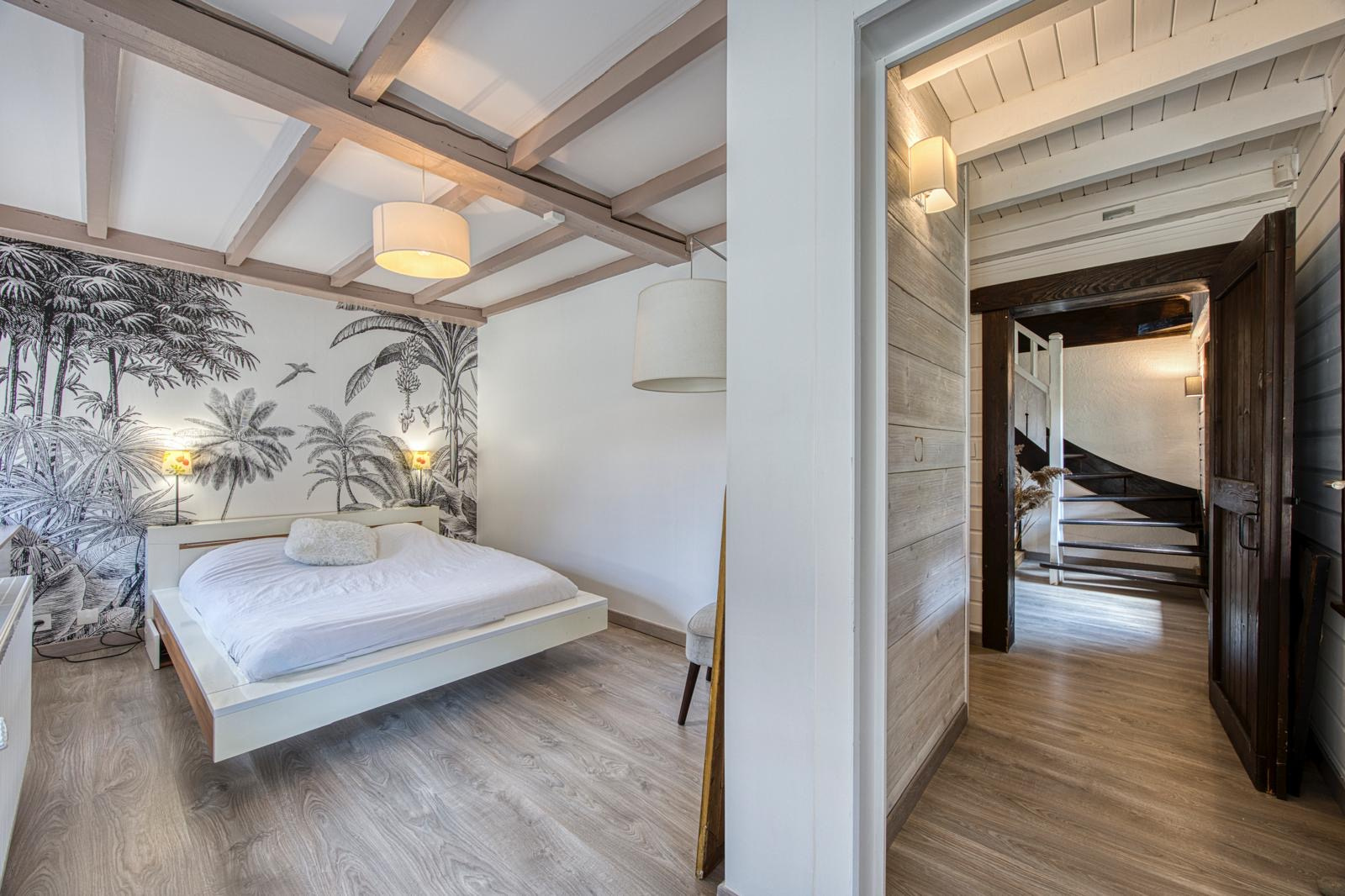 L'entrée s'ouvre sur un spacieux hall doté d'un dressing intégré. Le regard se porte aussitôt sur les escaliers ajourés, pièce maîtresse du lieu, apportant légèreté et raffinement à l'ensemble.