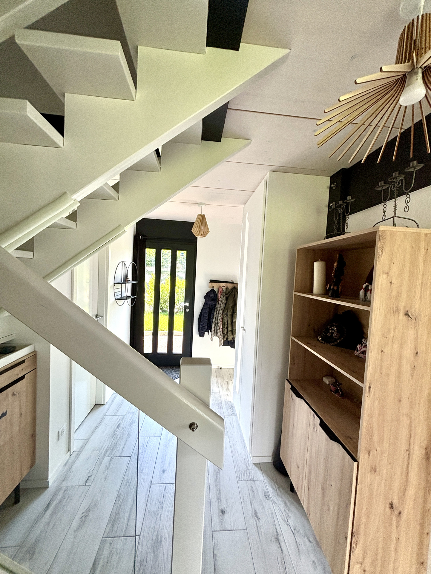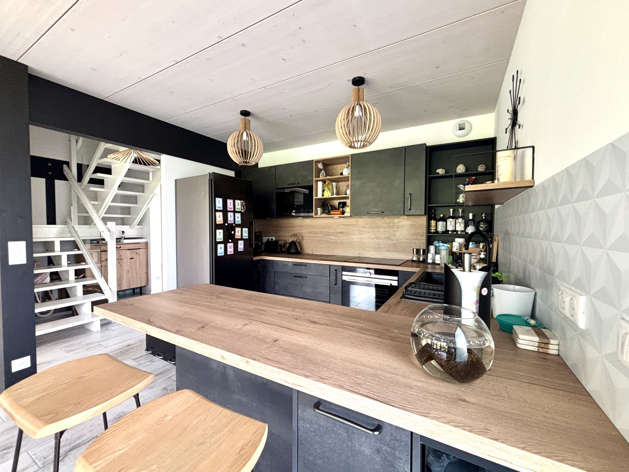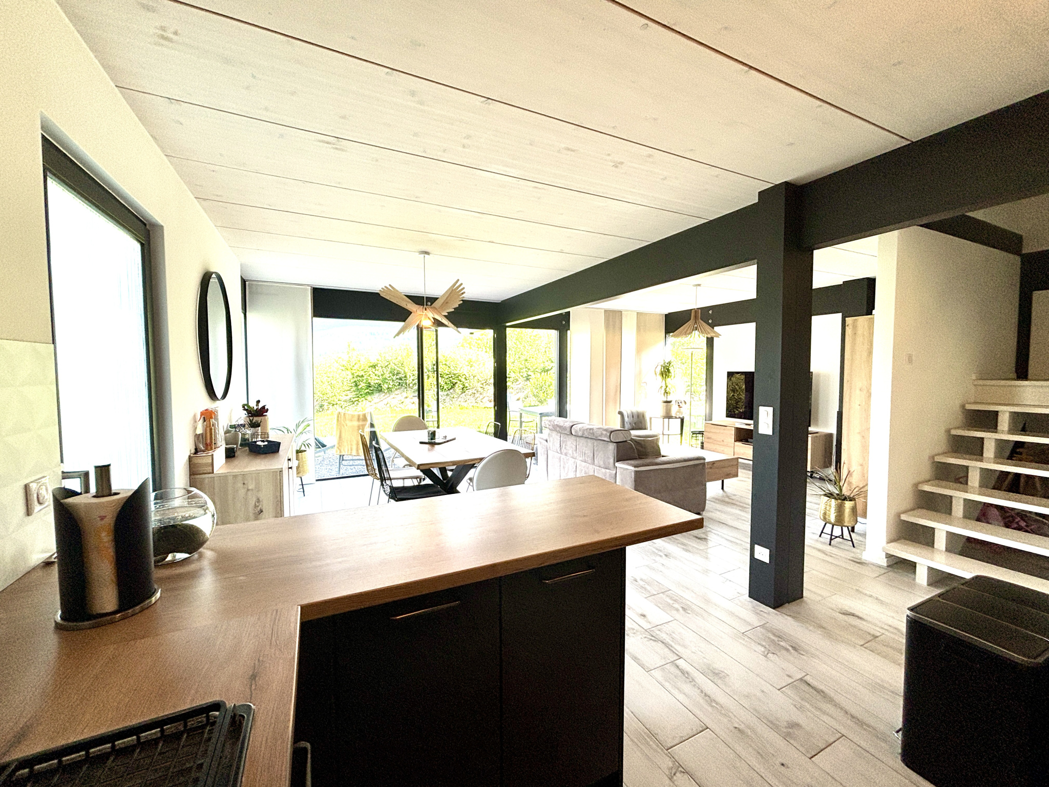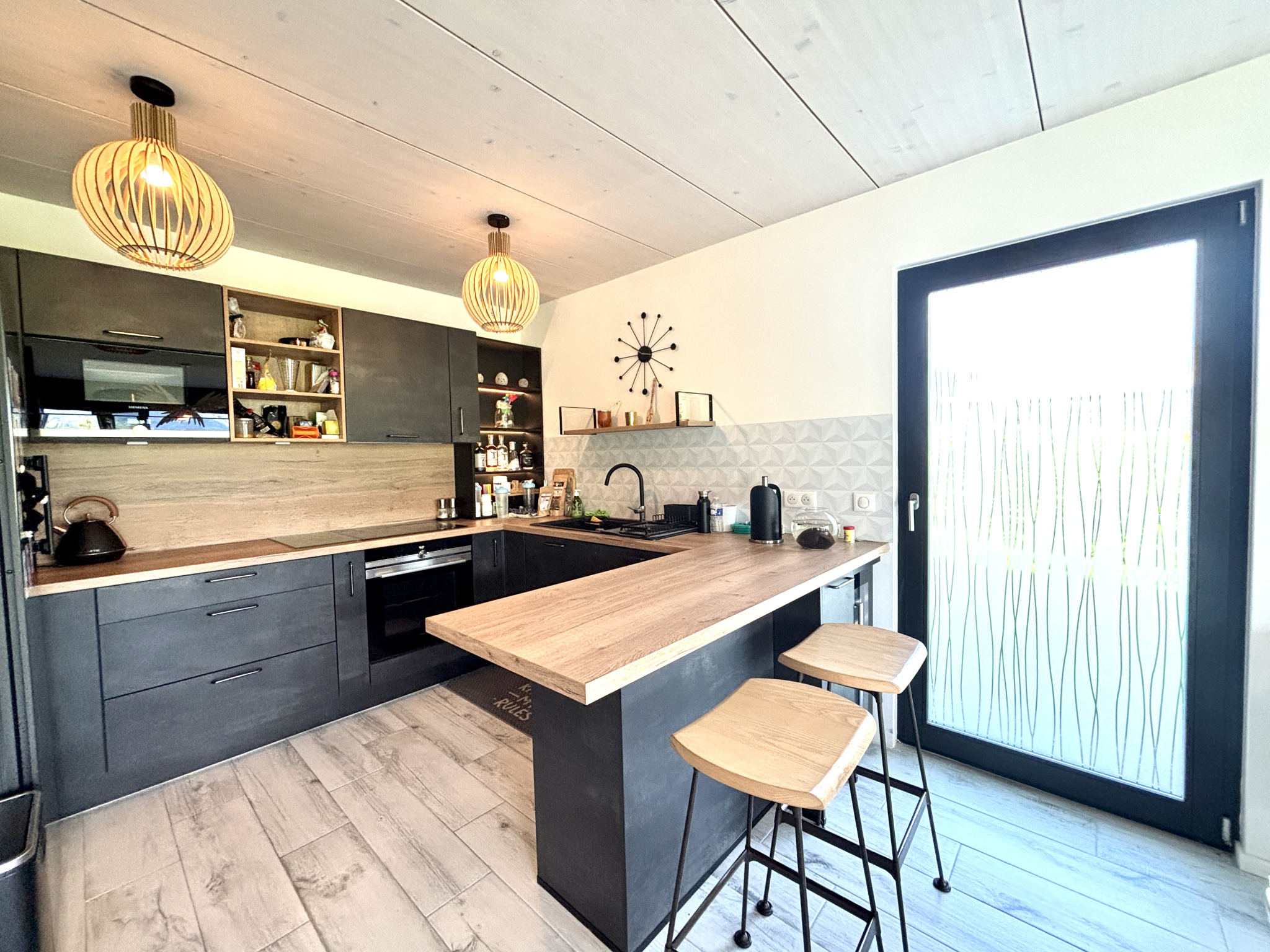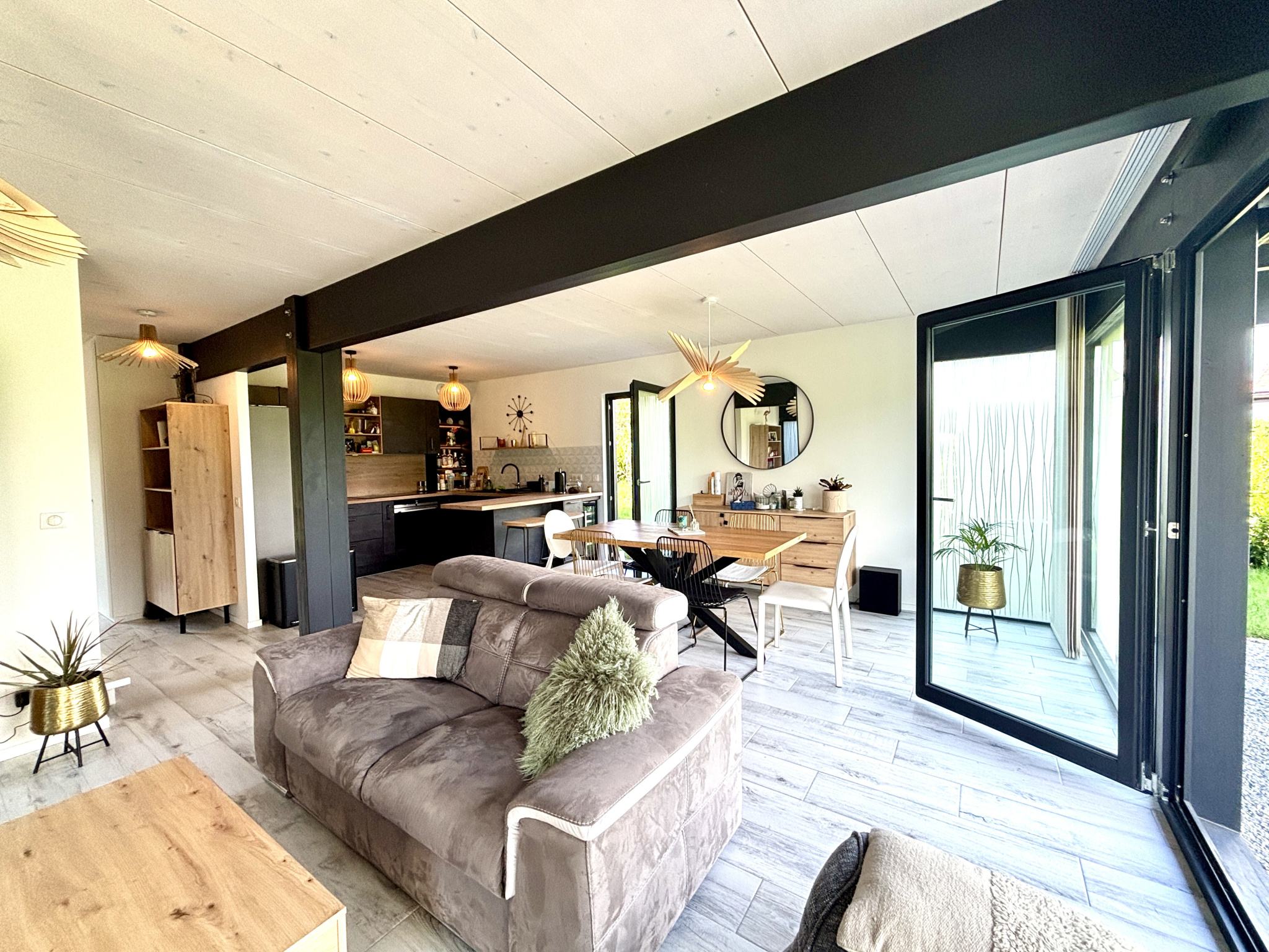 La cuisine contemporaine, intégralement équipée s'ouvre sur le séjour à la décoration très cosy. Le cellier en arrière cuisine, fait également office de buanderie pour plus de praticité.