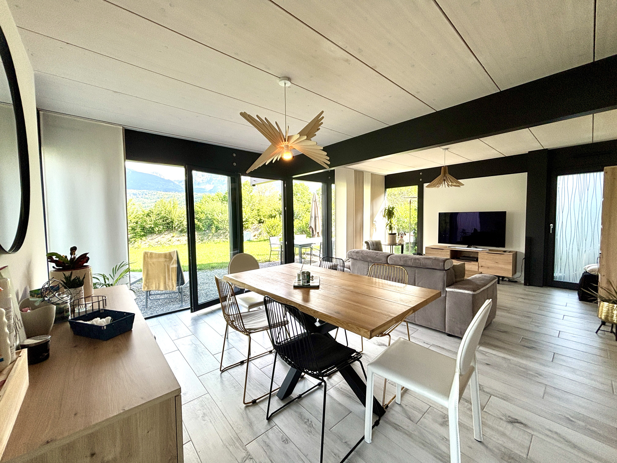 Vous serez séduit par la pièce de vie baignée de lumière grâce aux baies vitrées qui donnent sur le jardin exposé Sud.