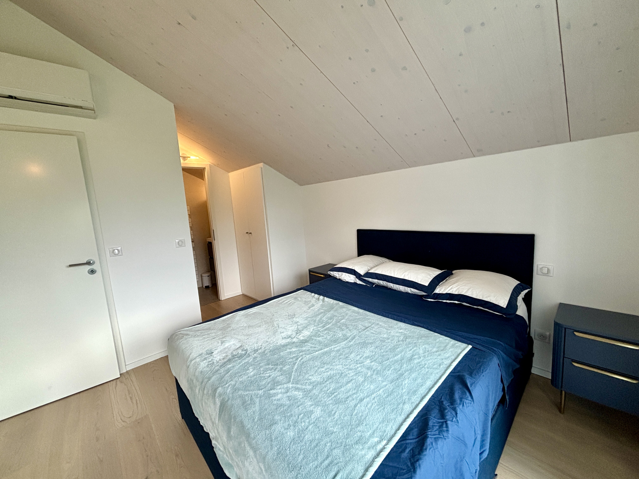 Le chauffage hydraulique au sol par pompe à chaleur au rez de la maison, couplé avec des climatisations réversibles à l'étage pour chaque chambre, offre un confort optimum et de faibles charges.