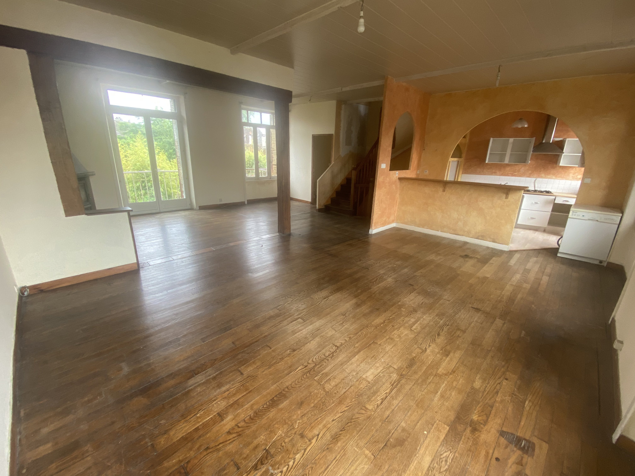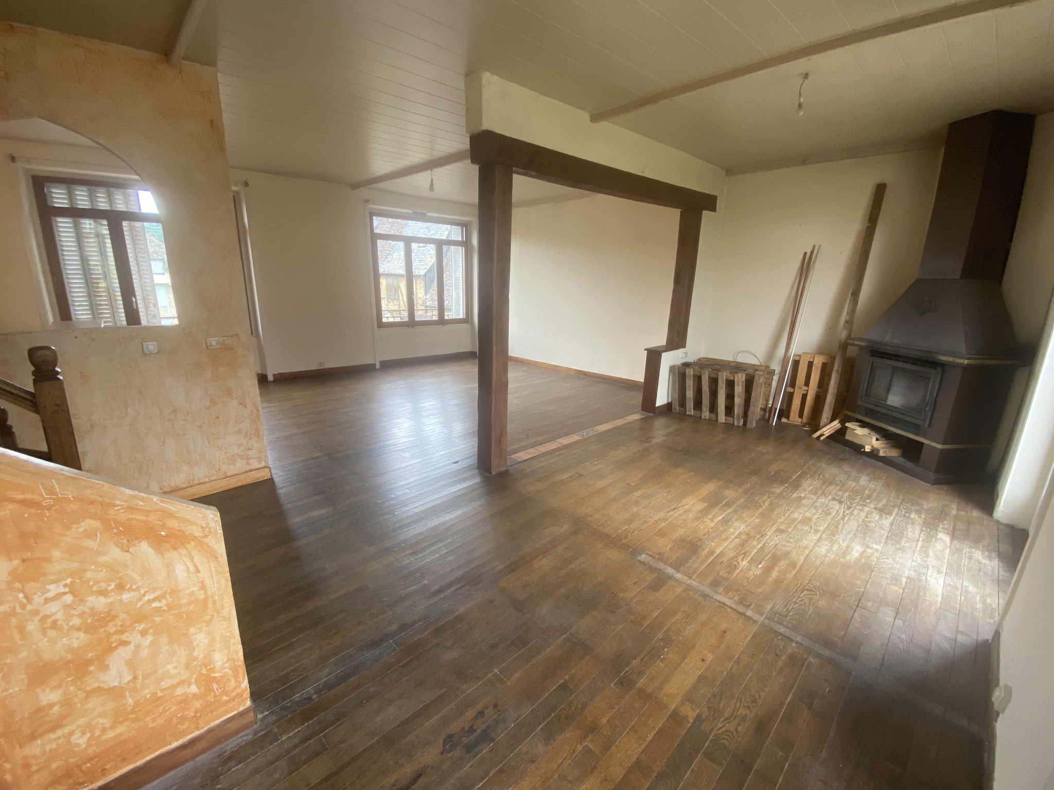 - Au 2ème et 3ème étages : un appartement de type 4 en duplex d'environ 112 m2, avec un beau potentiel, composé d'un salon-séjour avec coin cuisine ouverte, 3 chambres, une salle d'eau avec WC, et grenier.
