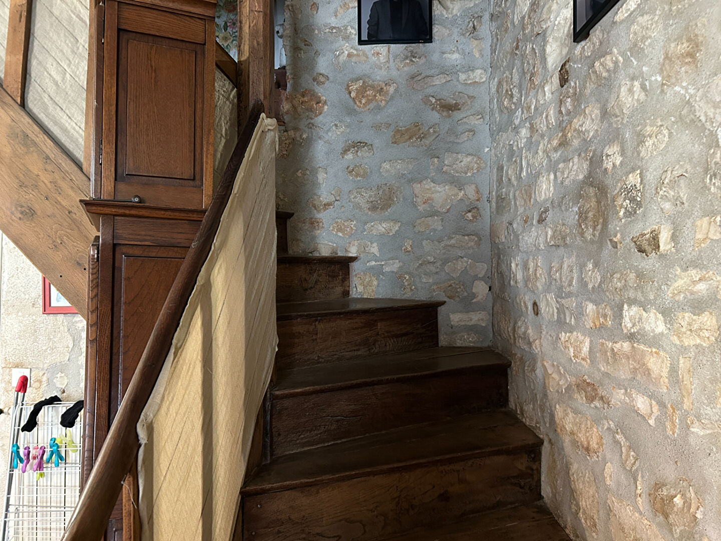 Elle se compose au rez-de-chaussée d'une entrée sur salon, une cuisine, un grand séjour, une salle d'eau avec WC et un accès à la cave.