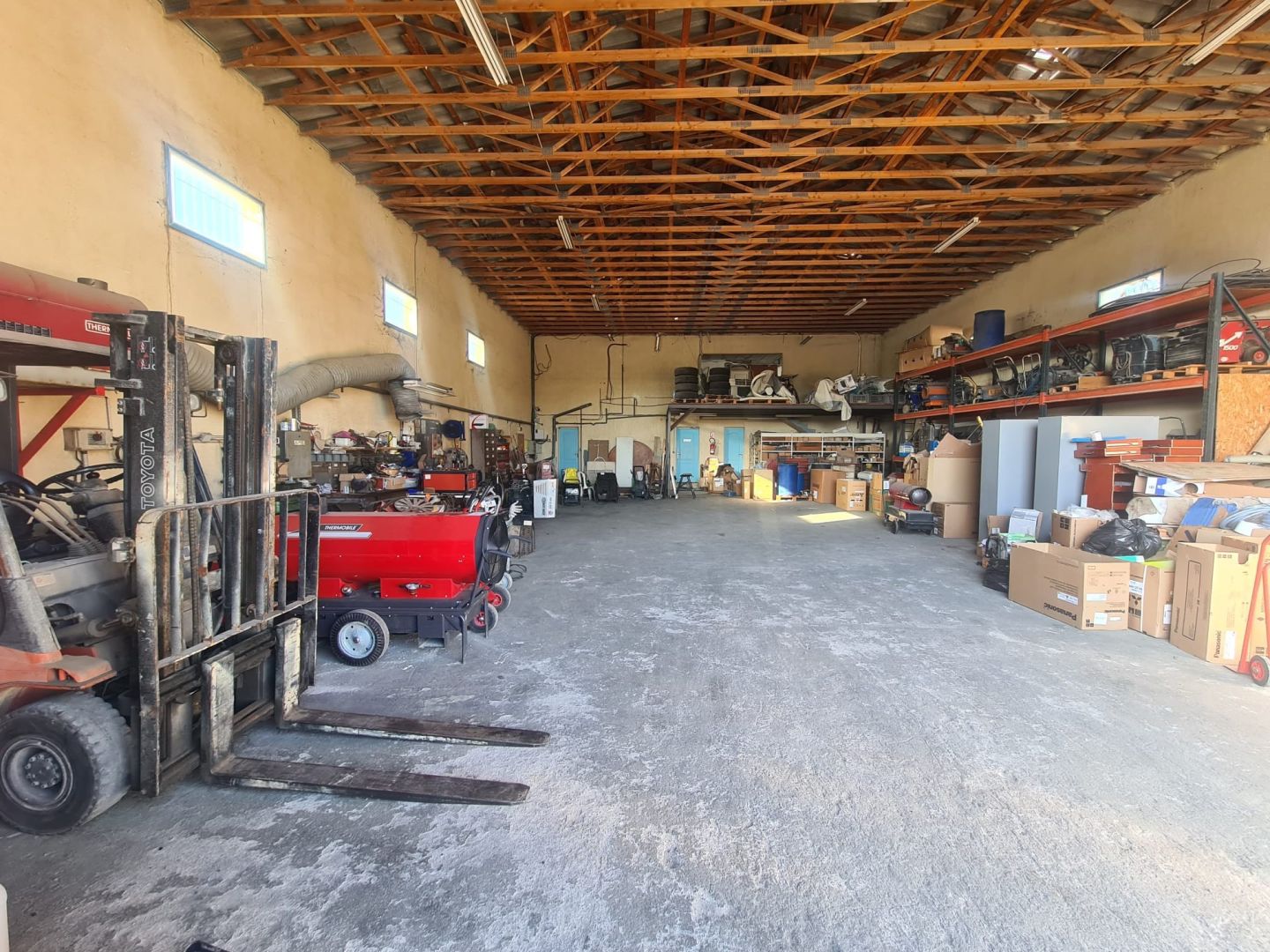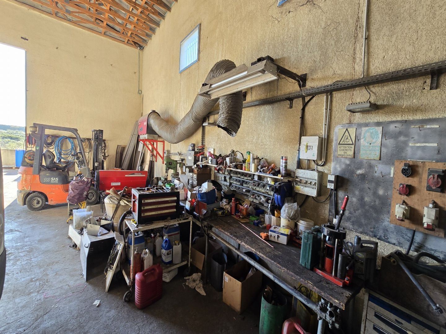 - Le 2ème espace, 265m² d'atelier avec un espace stockage quincaillerie, un espace outillage et un espace travail, le tout avec une grande porte d'entrée à l'arrière du bâtiment.