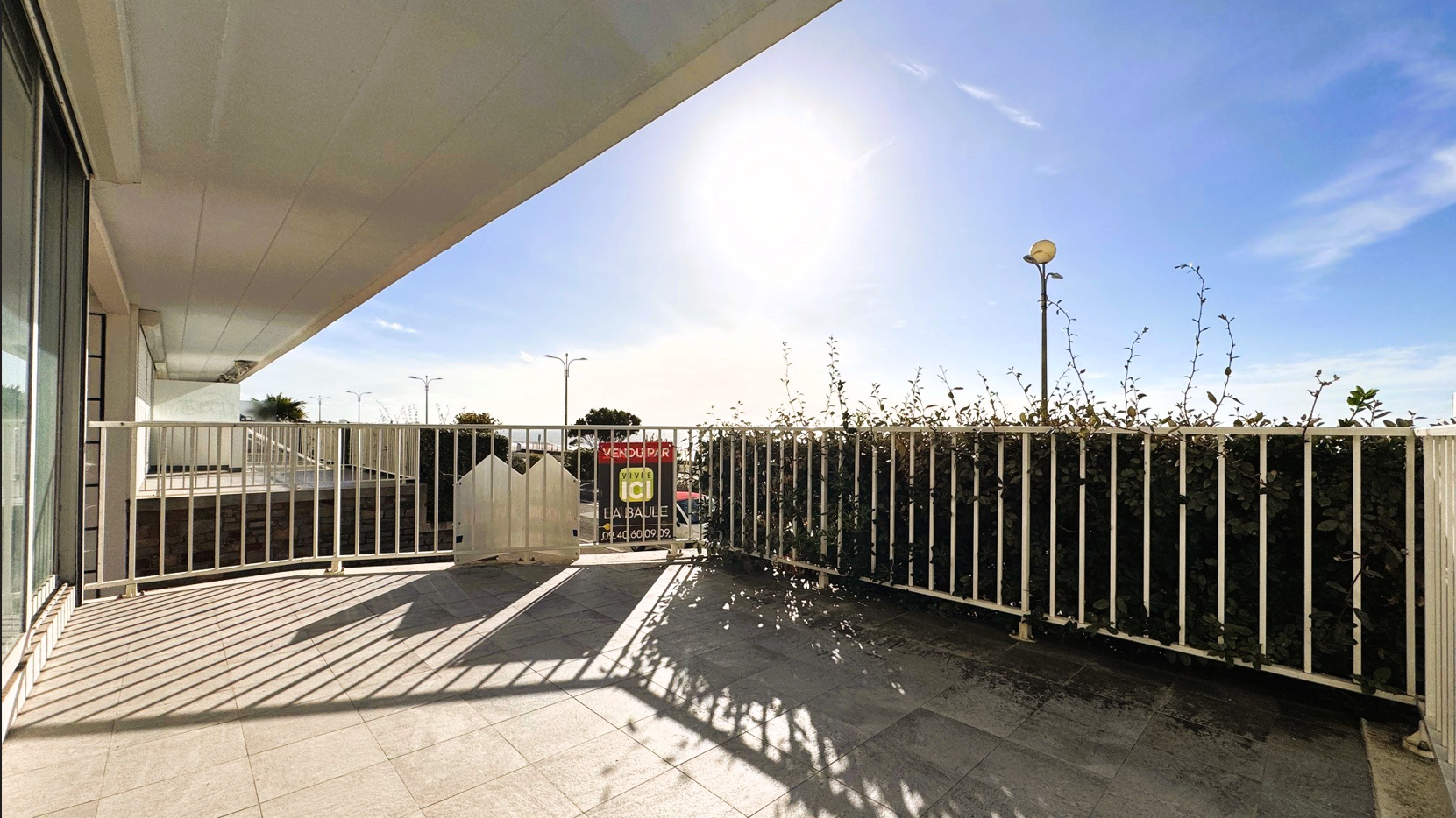 Appartement traversant en RDC surélevé, composé d'une entrée avec placards, une cuisine indépendante, un salon et un séjour exposé sud donnant sur une terrasse et face mer avec accès privatif sur la terrasse de 16m2. Deux chambres, une salle de bains, un WC.