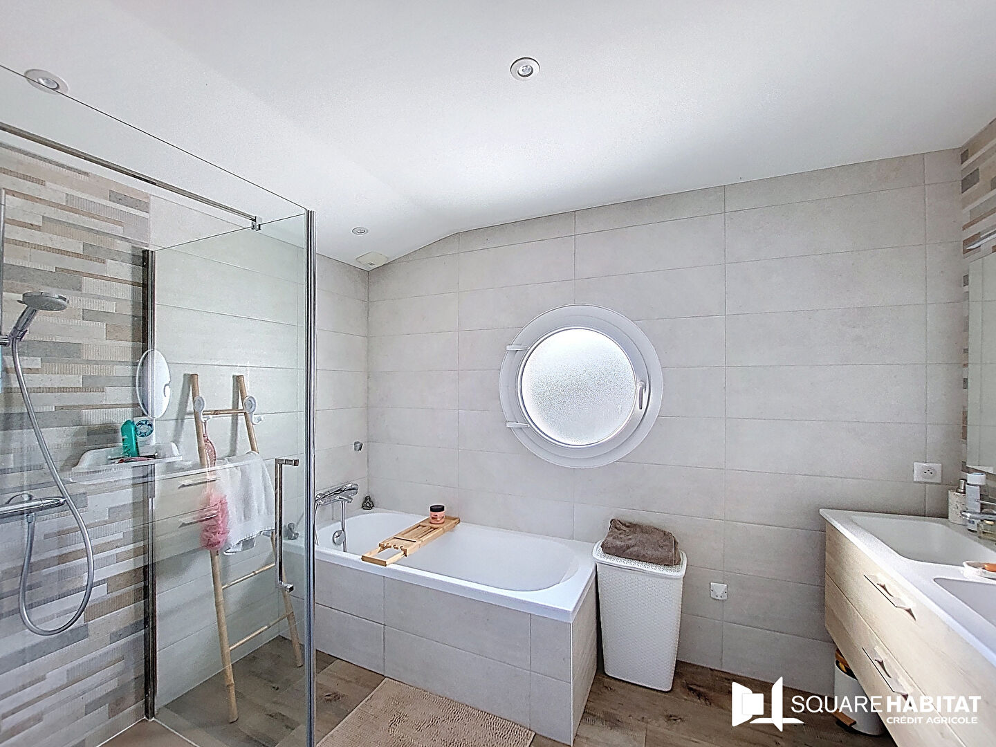 Elle se compose au rez-de-chaussée d'une entrée avec placard, d'un WC indépendant, d'un vaste séjour lumineux avec cuisine aménagée et équipée (hotte, four, lave-vaisselle), d'un salon chaleureux, d'un bureau, d'un cellier pratique et d'un garage.