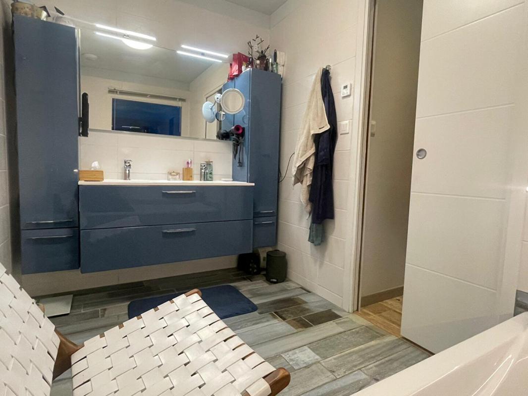 Puis un couloir avec espace bureau accueille les sanitaires avec lave mains, puis un bel escalier et un accès sur une magnifique pièce de 50 m² accueillant un spa de nage , WC et douche . Cette pièce est décorée de façon à ce que vous vous sentiez en vacances ( PVC TENDU donc déco modifiable)