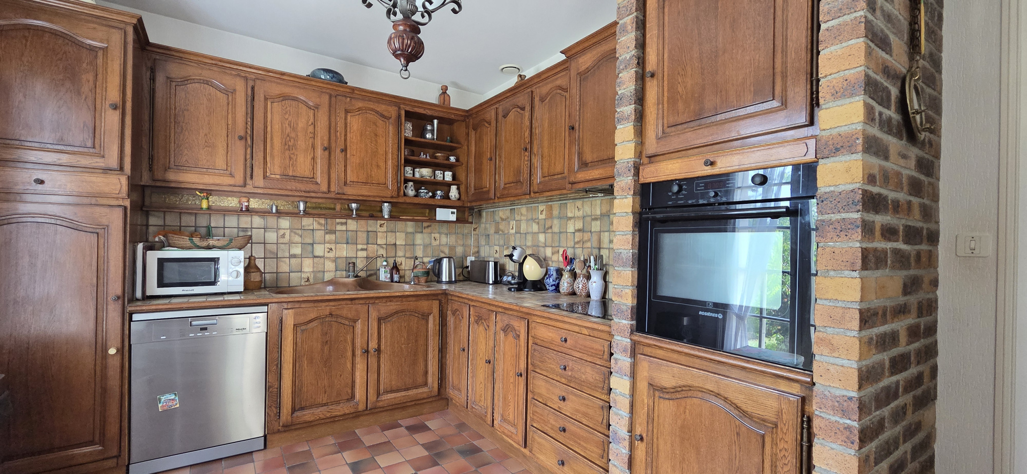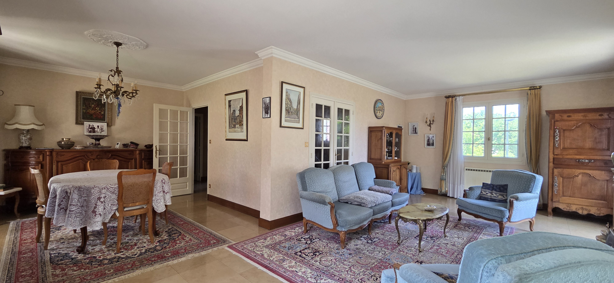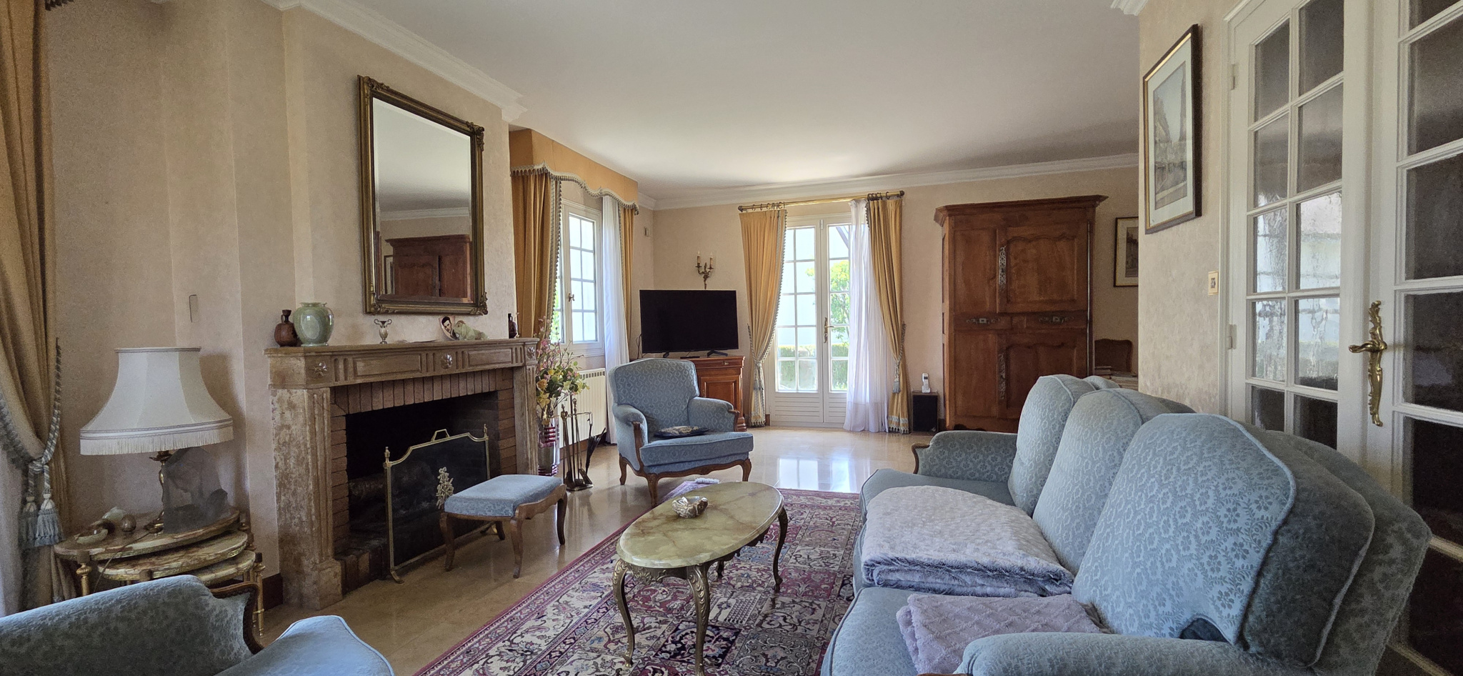 Le hall d'entrée avec plafond cathédrale assoie déjà les codes des constructions cossues à l'architecture déployée constitués d'un séjour/salon de 40m2 avec cheminée et 3 p/fenêtres donnant sur une terrasse sud avec store et une cuisine aménagée indépendante .