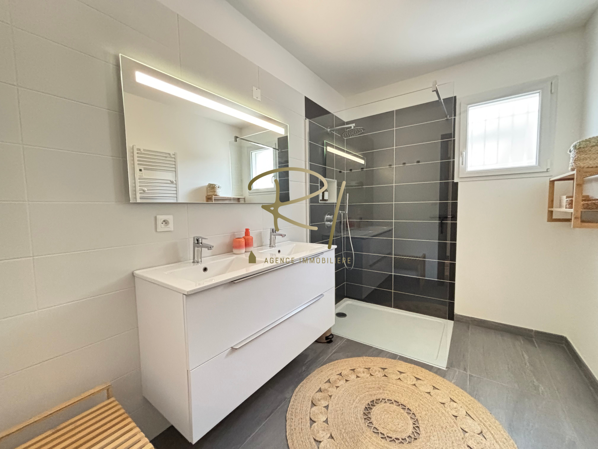Elle se compose d'une vaste pièce de vie de 45m2 avec cuisine ouverte entièrement équipée, 5 chambres dont une suite parentale avec salle d'eau et grand dressing, une buanderie, une seconde salle d'eau indépendante avec WC séparé.
