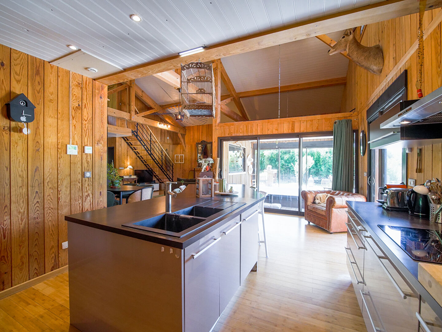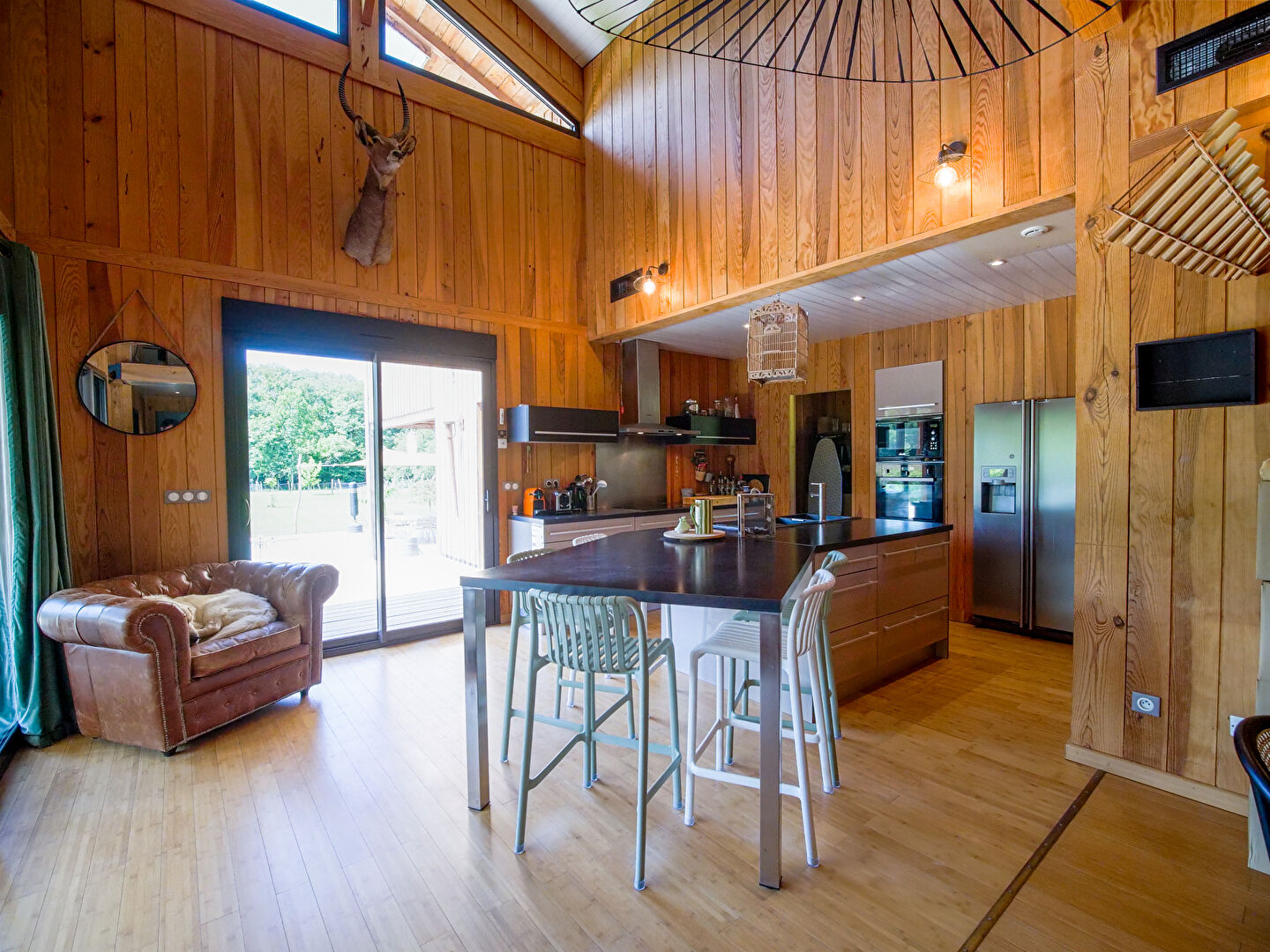 - une vaste pièce de vie avec poêle à bois et de grandes baies vitrées ouvertes sur l'extérieur,