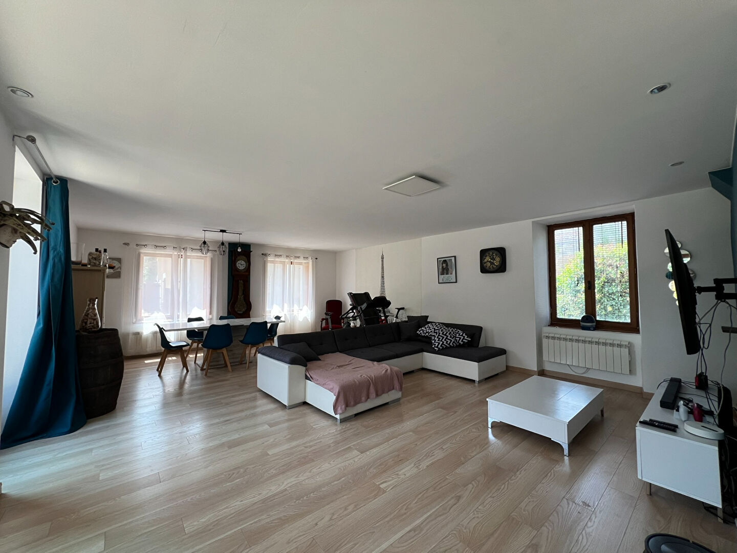 Cette maison est reliée au tout à l'égout et côté équipement nous avons des huisseries en bois avec double vitrage, un ballon d'eau chaude de 300L, des radiateurs électriques, un insert à bois et possède des panneaux photovoltaïque avec 2500Euro environs de revente par an !!