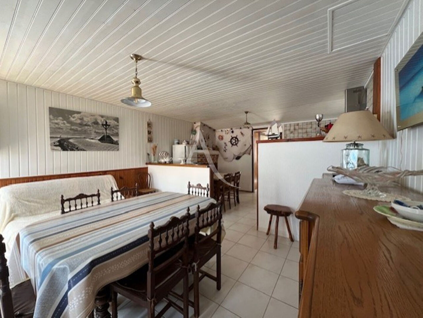 Décorée dans un style marin simple et soigné, elle comprend deux chambres de plain-pied dont une mezzanine qui inclut une troisième chambre, une pièce de vie conviviale, une cuisine, une salle d'eau et des WC séparés.