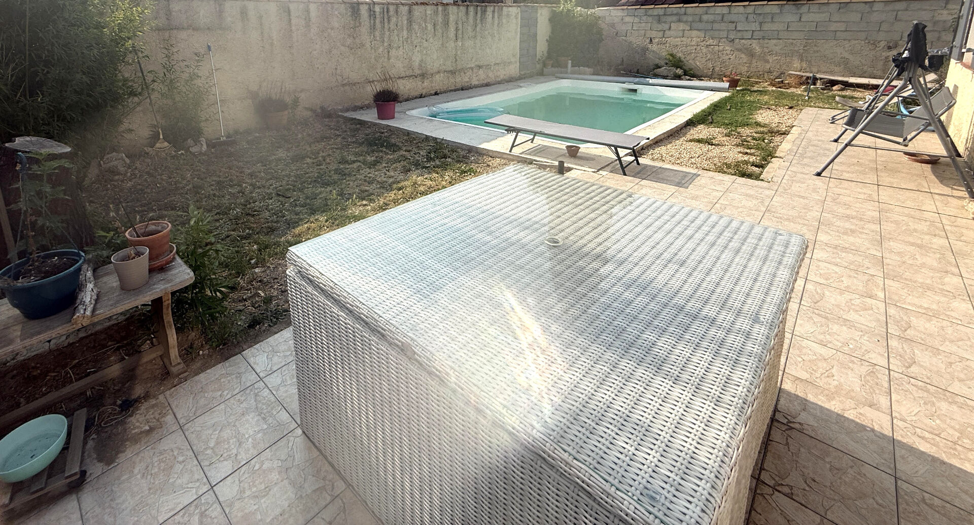 Maison de plain pied, de Type 4 d'env. 85 m² comprenant, une cuisine équipée, un séjour, 3 chambres, une salle d'eau et des toilettes. Le tout sur une parcelle de 460 m² avec jardin, terrasse, piscine, neuve , barbecue et un garage aménagé en studio.