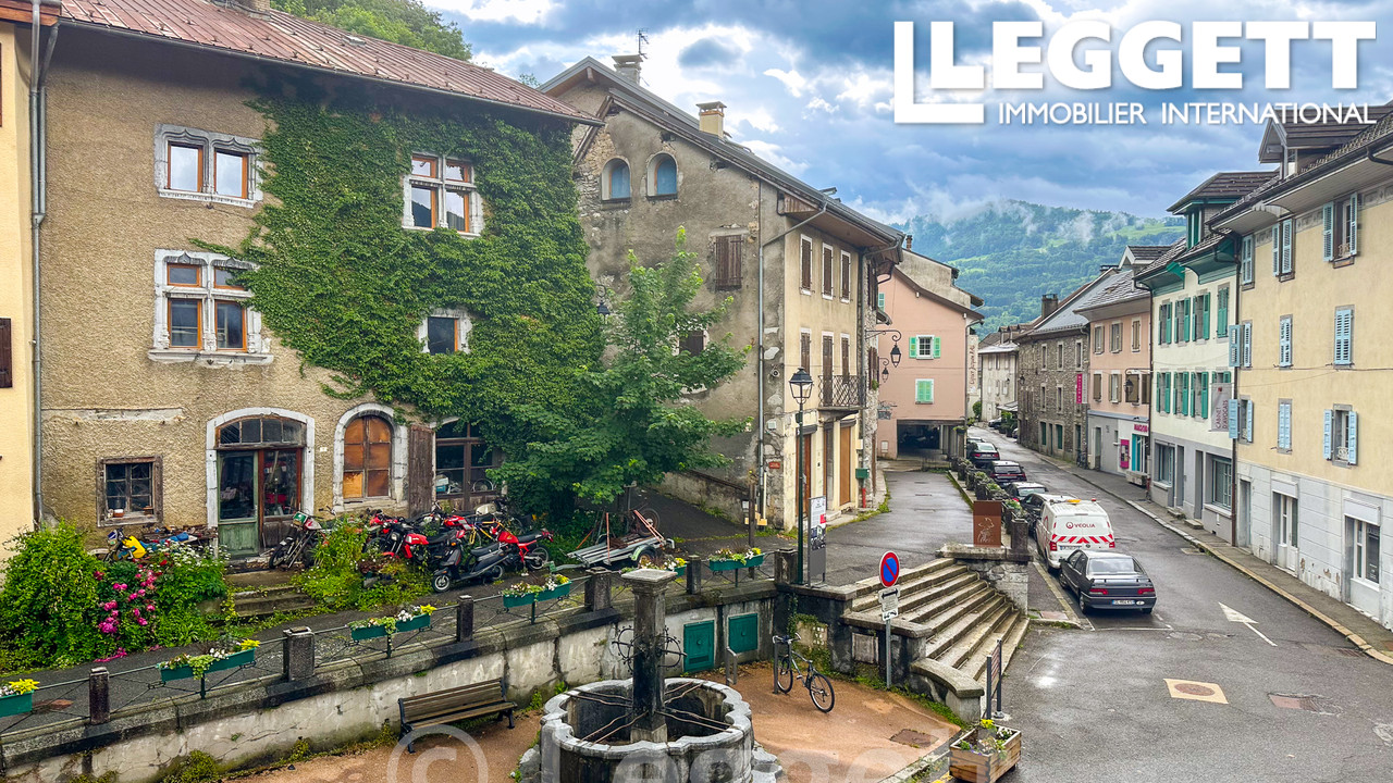 *Il surplombe le vieux centre du village avec sa fontaine ornée et la rivière Foron de l'autre côté.