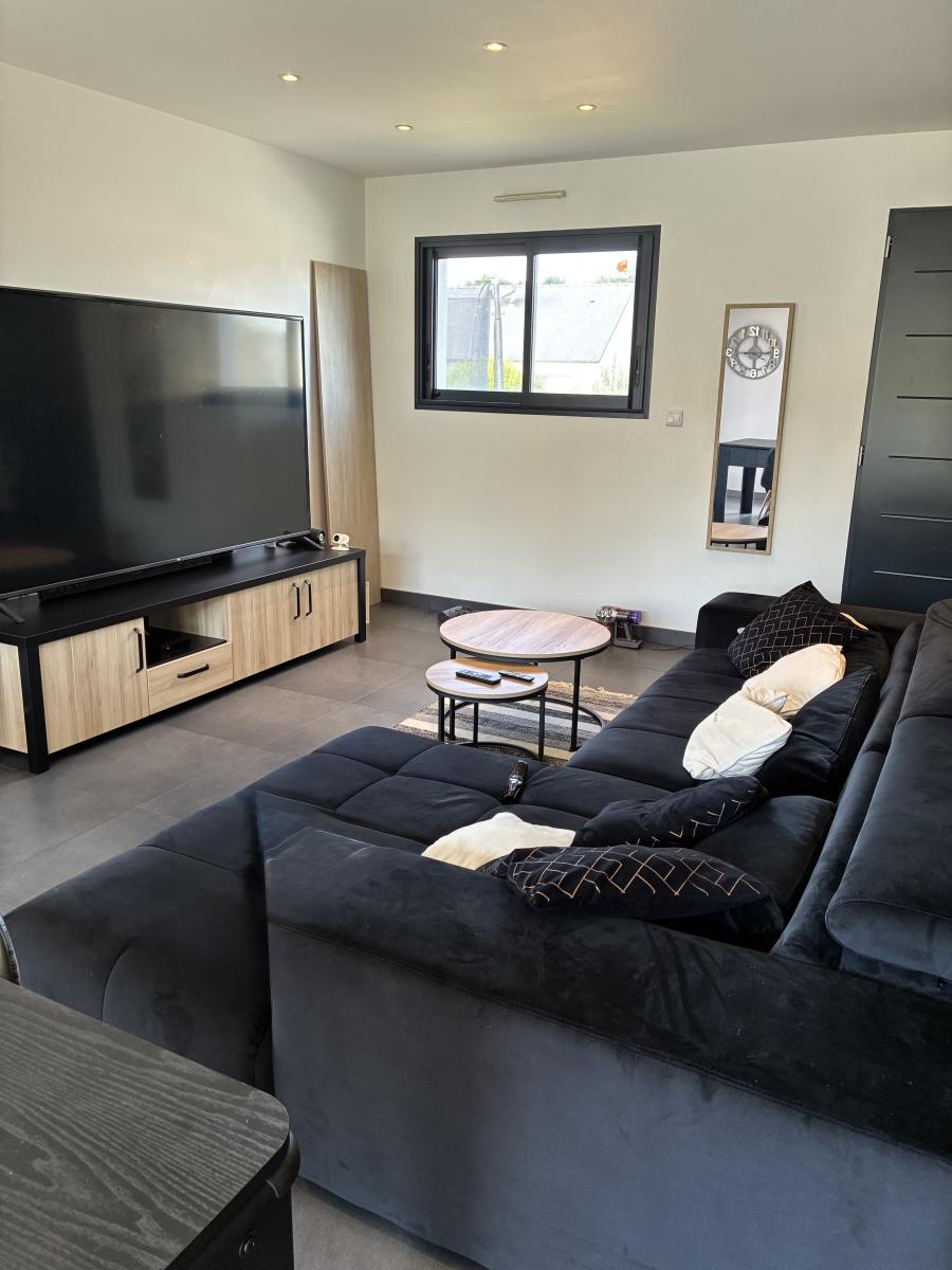 Elle est composée d'une cuisine ouverte sur la salle à manger/séjour avec vue sur la terrasse et le jardin exposé Sud/ Ouest puis un salon .