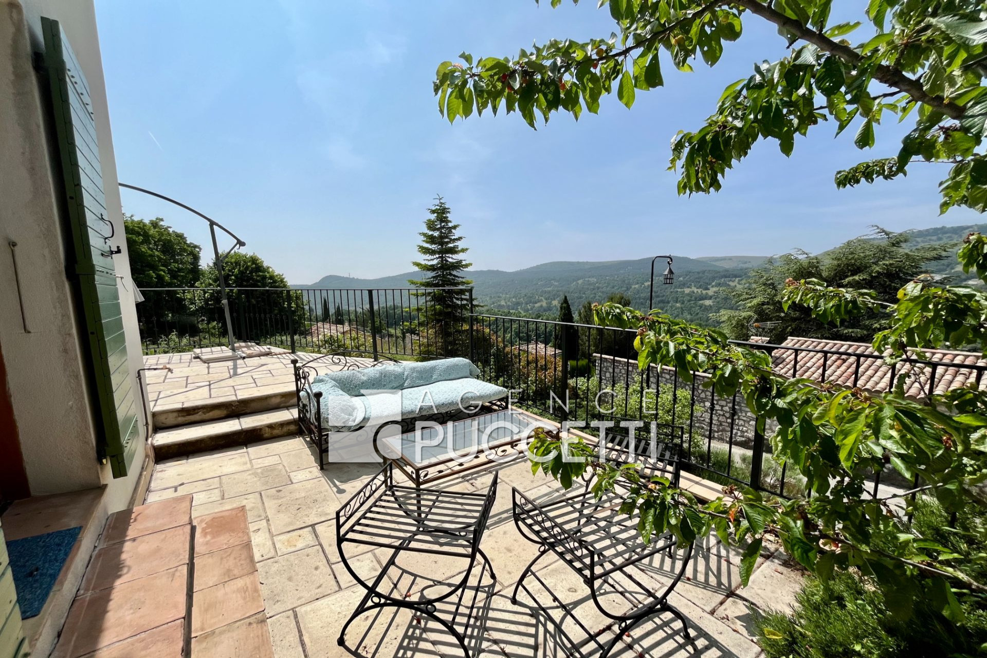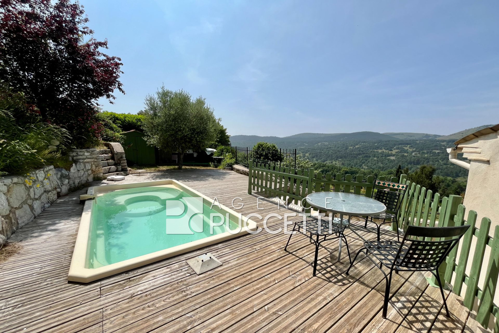Jouxtant la maison, deux belles terrasses offrant des vues panoramiques vers le sud et la nature, et un espace aménagé avec piscine et chalet de jardin.