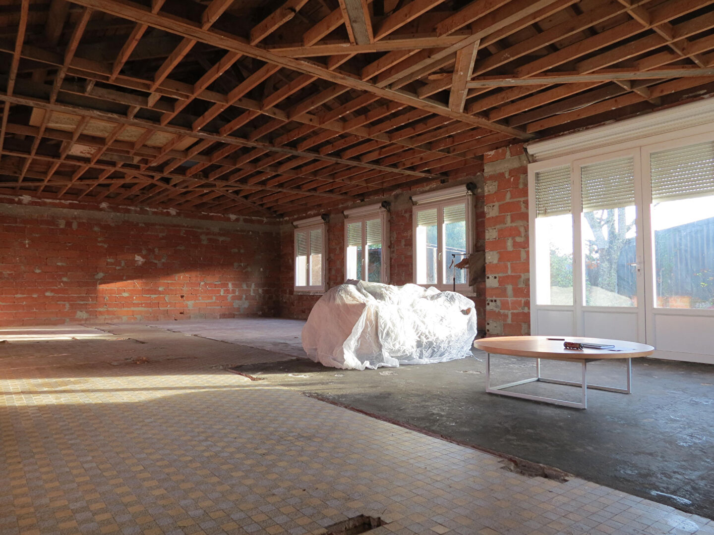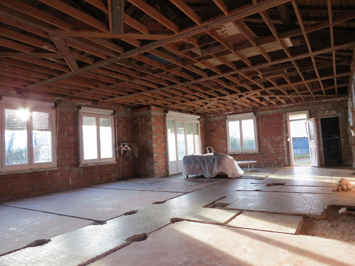 La maison a été décloisonnée entièrement, laissant place à un vaste espace ouvert. L'intérieur est à réaménager à votre goût.