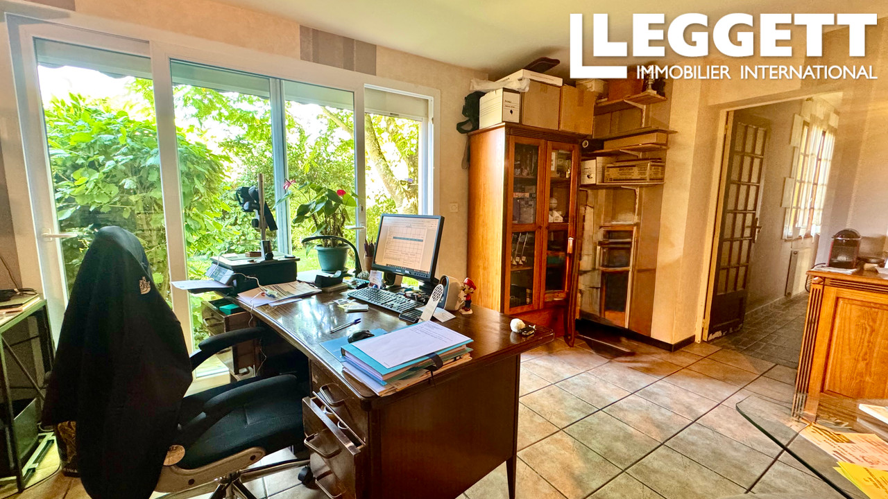 Une pièce actuellement utilisée comme grand bureau avec accès extérieur peut permettre une activité professionnelle au domicile ou devenir un salon spacieux.