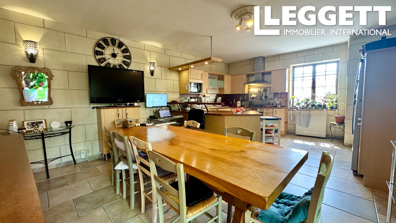 La cuisine lumineuse est ouverte sur l'espace repas accueillant actuellement une table 10/12 personnes et donne un accès direct sur la terrasse extérieure.