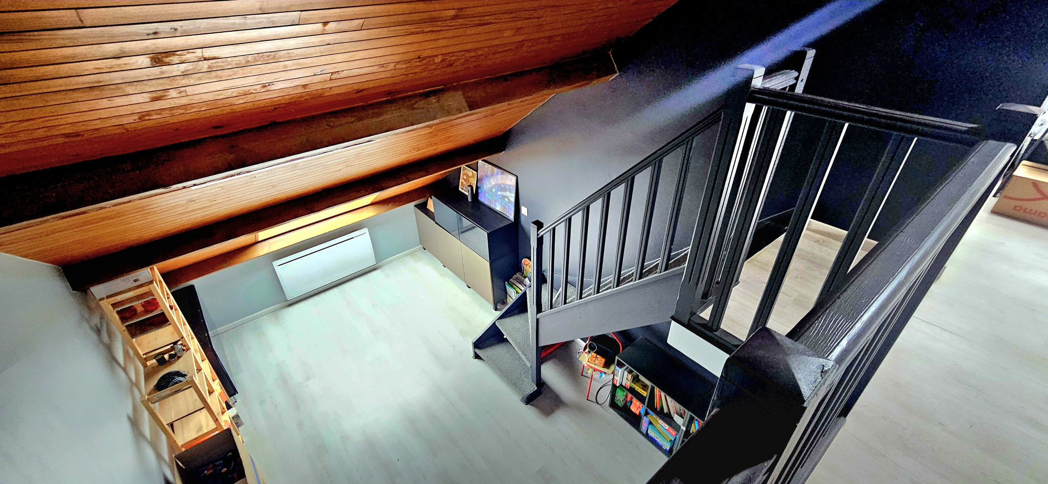 Hall d'entrée, cuisine équipée et aménagée, salon, deux chambres, dressing, salle de bains, wc séparés, mezzanine et bureau, cave, séchoir.