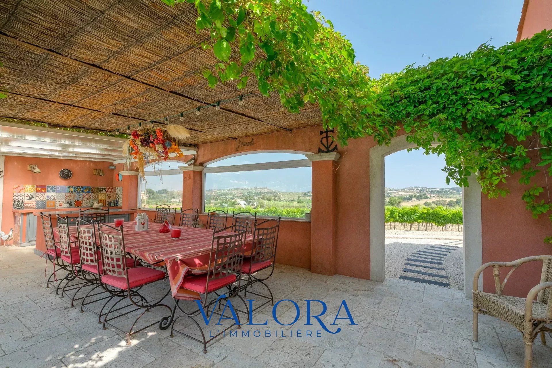 À l’intérieur vous trouverez au rez-de-chaussée une belle pièce à vivre ouverte sur l'extérieur, d'une magnifique cuisine ouverte avec plan de travail en pierre et d'une salle à manger indépendante avec vue directe sur vos vignes.