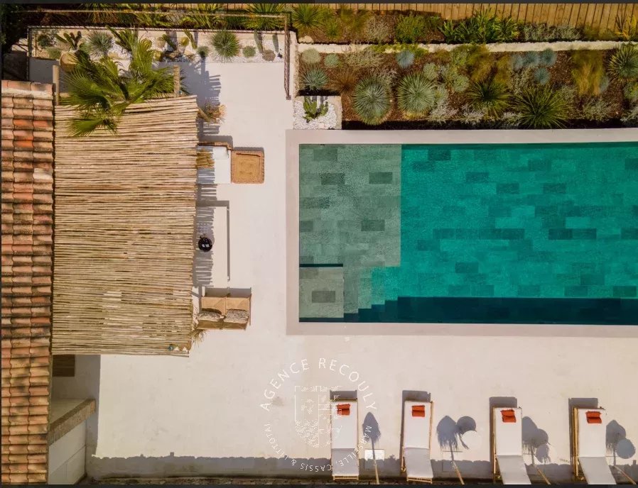 Cette villa de style méditerranéen vous offre un cadre de vie exceptionnel, avec un jardin luxuriant inspiré du maquis corse, rempli de plantes aromatiques et d'oliviers centenaires, ainsi qu'une élégante piscine et un espace de détente pour profiter de magnifiques couchers de soleil toute l'année.
