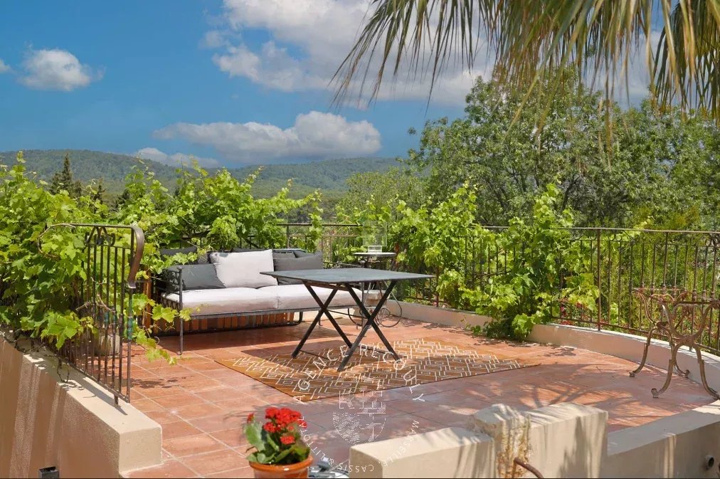 La maison principale de style bergerie corse s'étend sur 2 niveaux, reliés par un escalier intérieur et un ascenseur. En entrant par la porte principale, vous vous retrouvez sur une terrasse ombragée de 200m², avec une cuisine d'été entièrement équipée.