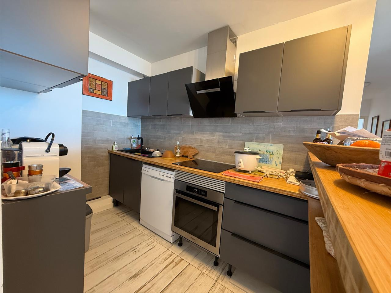 Salon lumineux avec coin cuisine, offrant un espace de vie moderne et convivial.