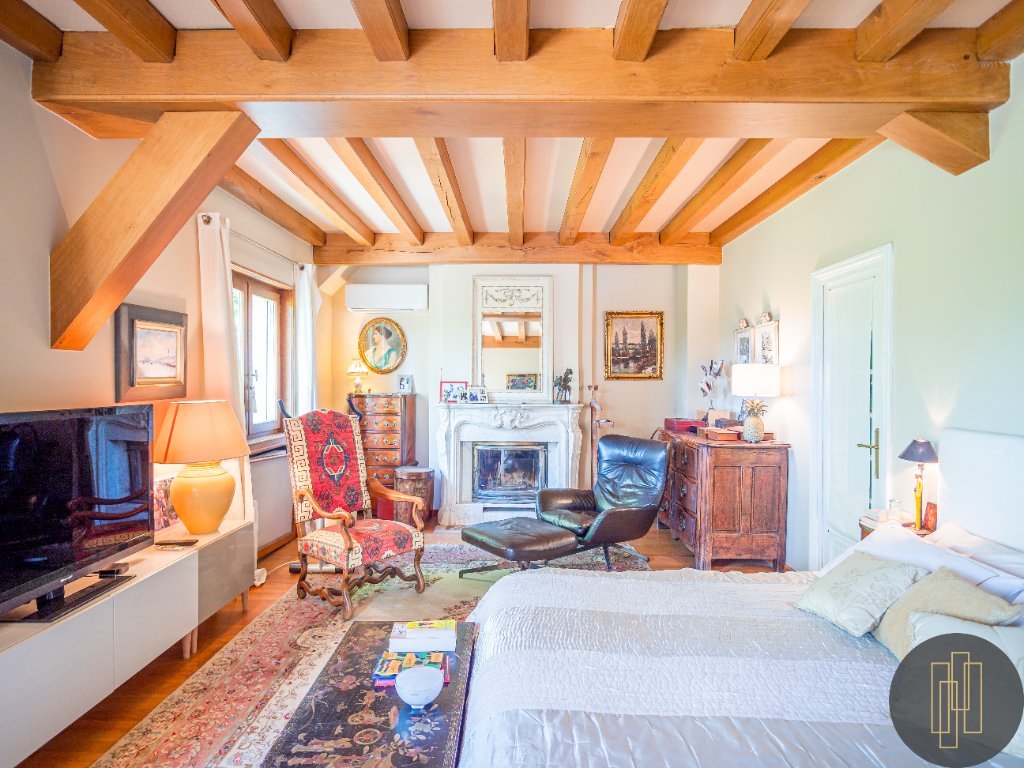 À l'extérieur, le parc verdoyant  arboré constitue un véritable écrin de nature, sublimant l'ensemble. Un chemin mène vers un agréable espace piscine en contrebas, ainsi qu'un charmant chalet indépendant, comprenant une pièce de vie avec cuisine, salle de bains, WC, et une chambre à l'étage.