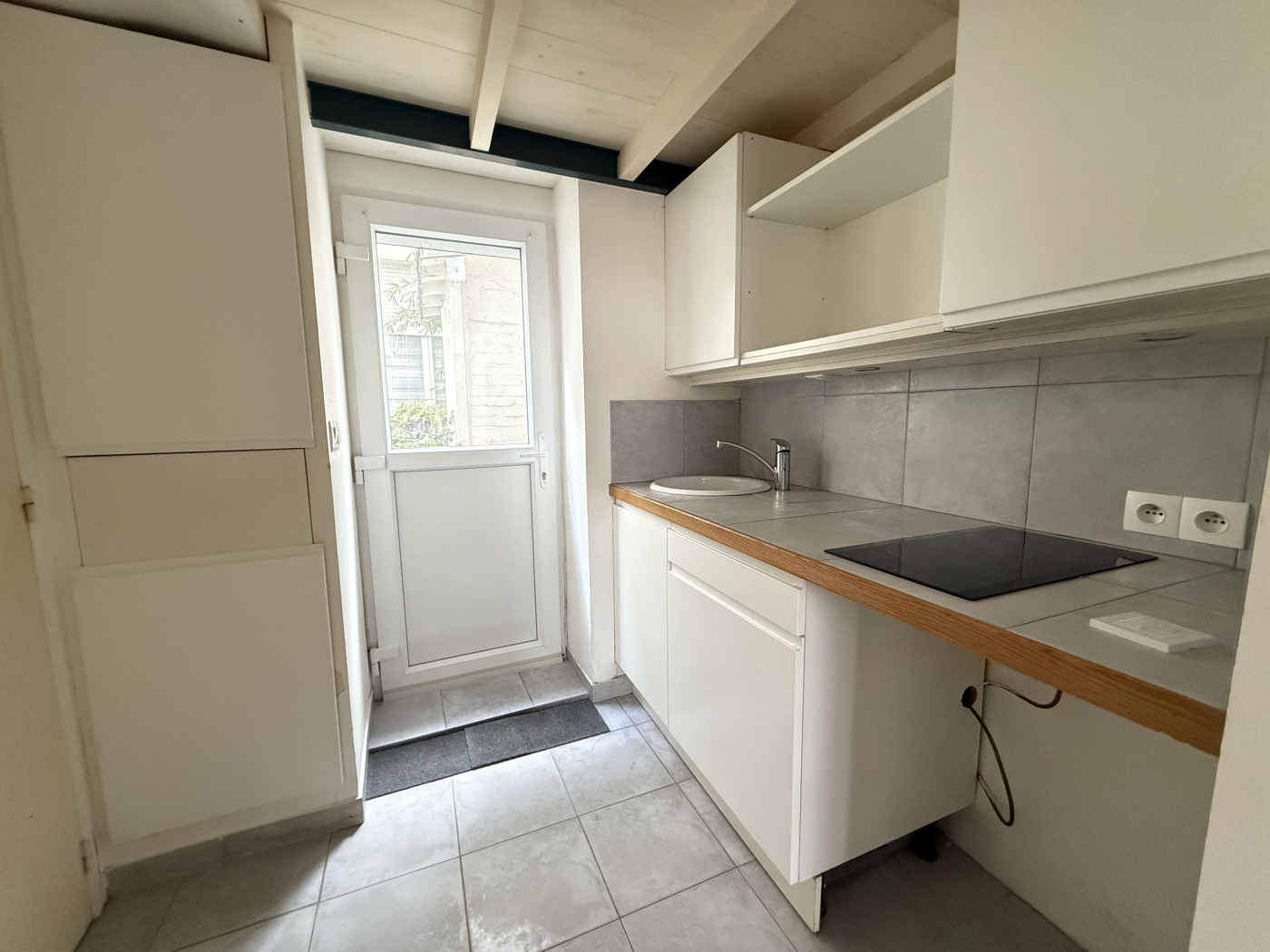 Situé au rez-de-chaussée d'une petite copropriété, cet appartement offre une pièce de vie avec mezzanine, une cuisine et une salle d'eau contemporaine avec douche à l'italienne et WC.