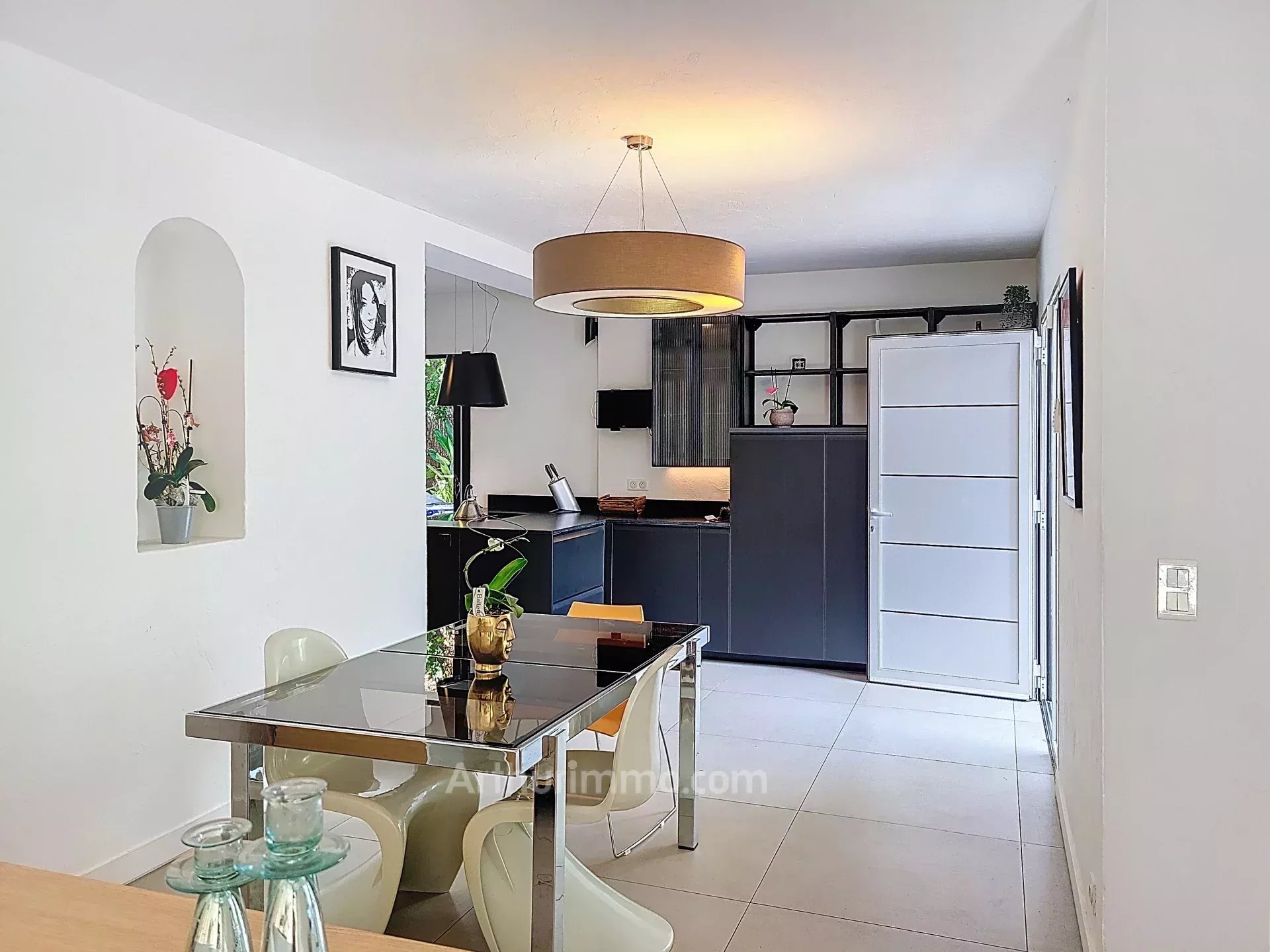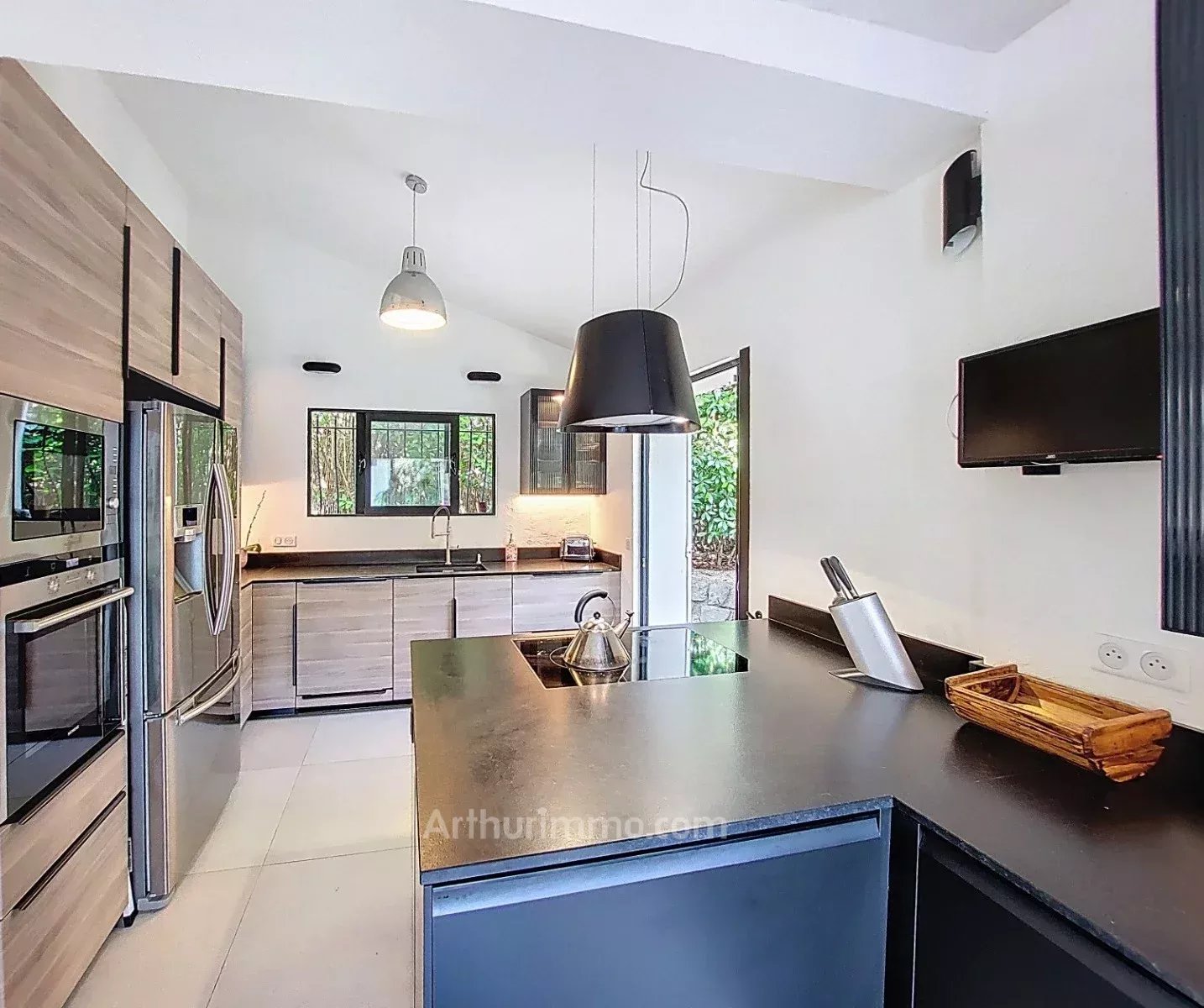 Belle cuisine récente, moderne et équipée, ouverte sur une terrasse verdoyante idéale pour vos repas en extérieur